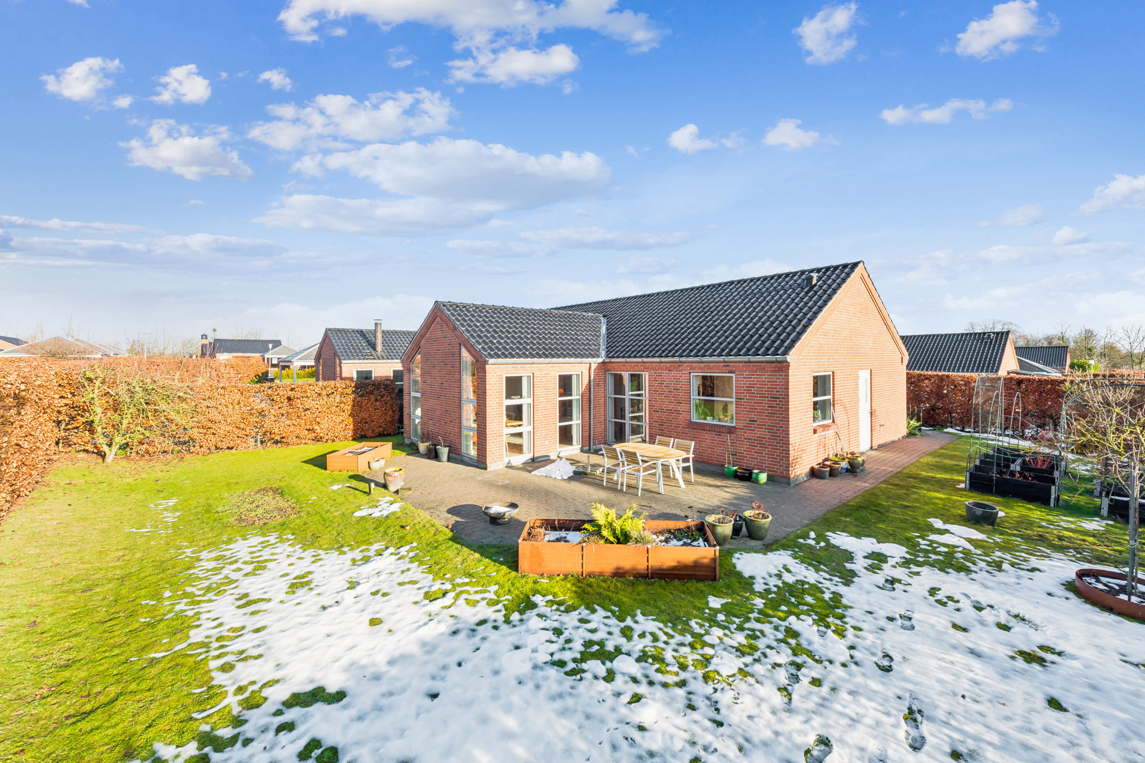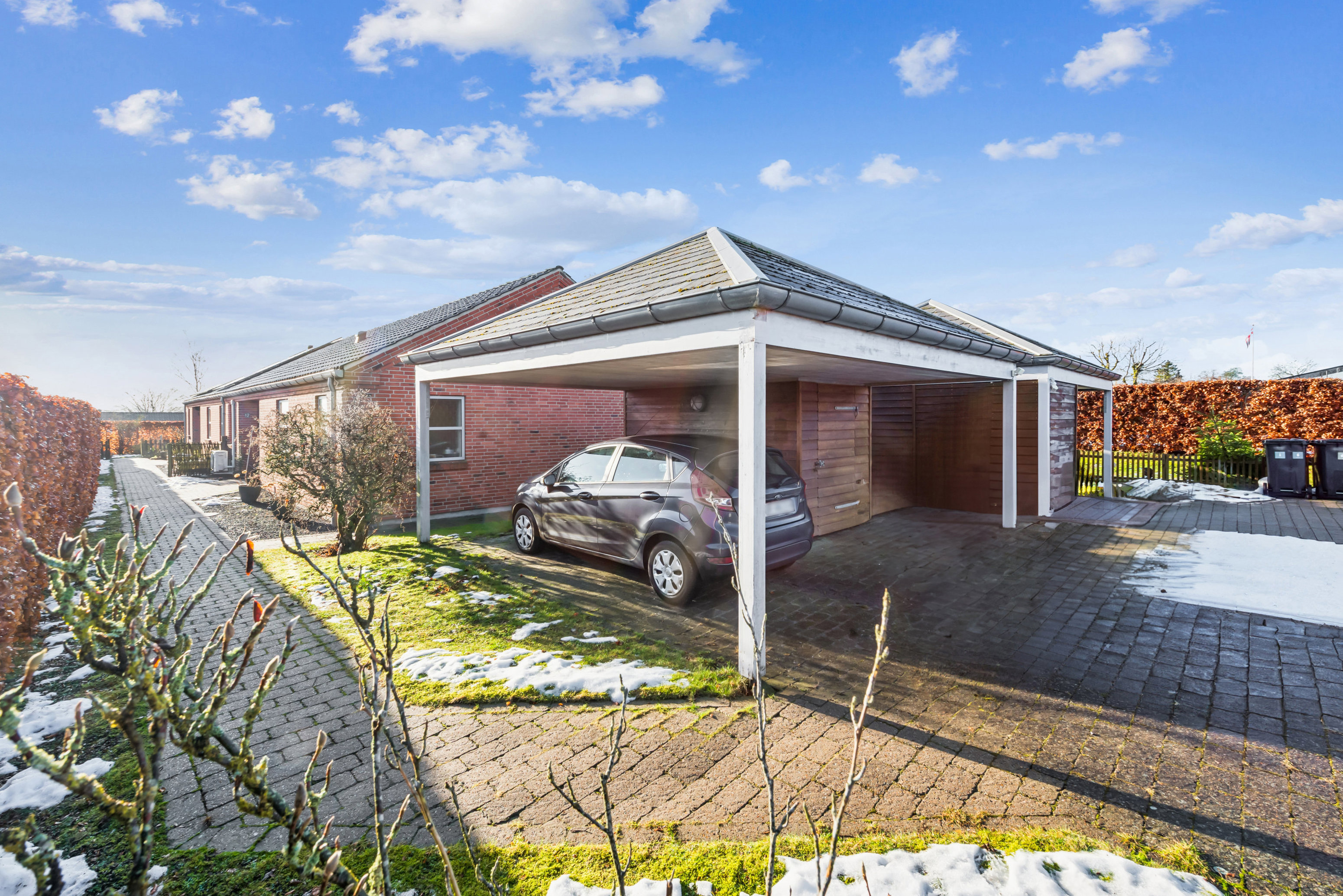 Fra boligen er der direkte adgang til haven, som er overskuelig og nem at holde. Her er plads til leg, afslapning og udeliv, og haven giver mulighed for at skabe private hyggekroge, terrassemiljø eller grønne bede efter egne ønsker. Den rolige beliggenhed gør det let at nyde udelivet i fredelige omgivelser. Udover den skønne private have, tilbyder boligen også egen privat carport med udhus
