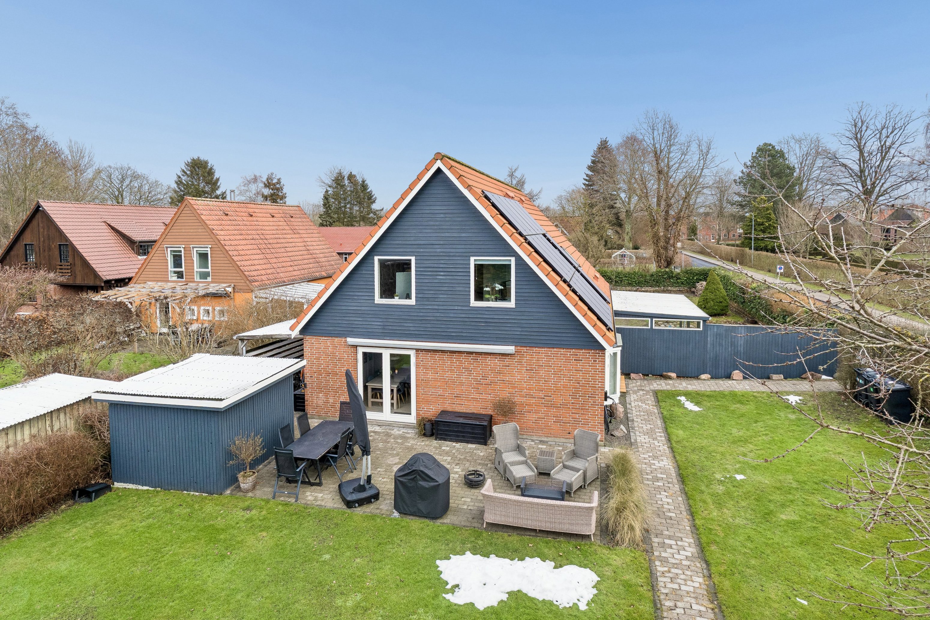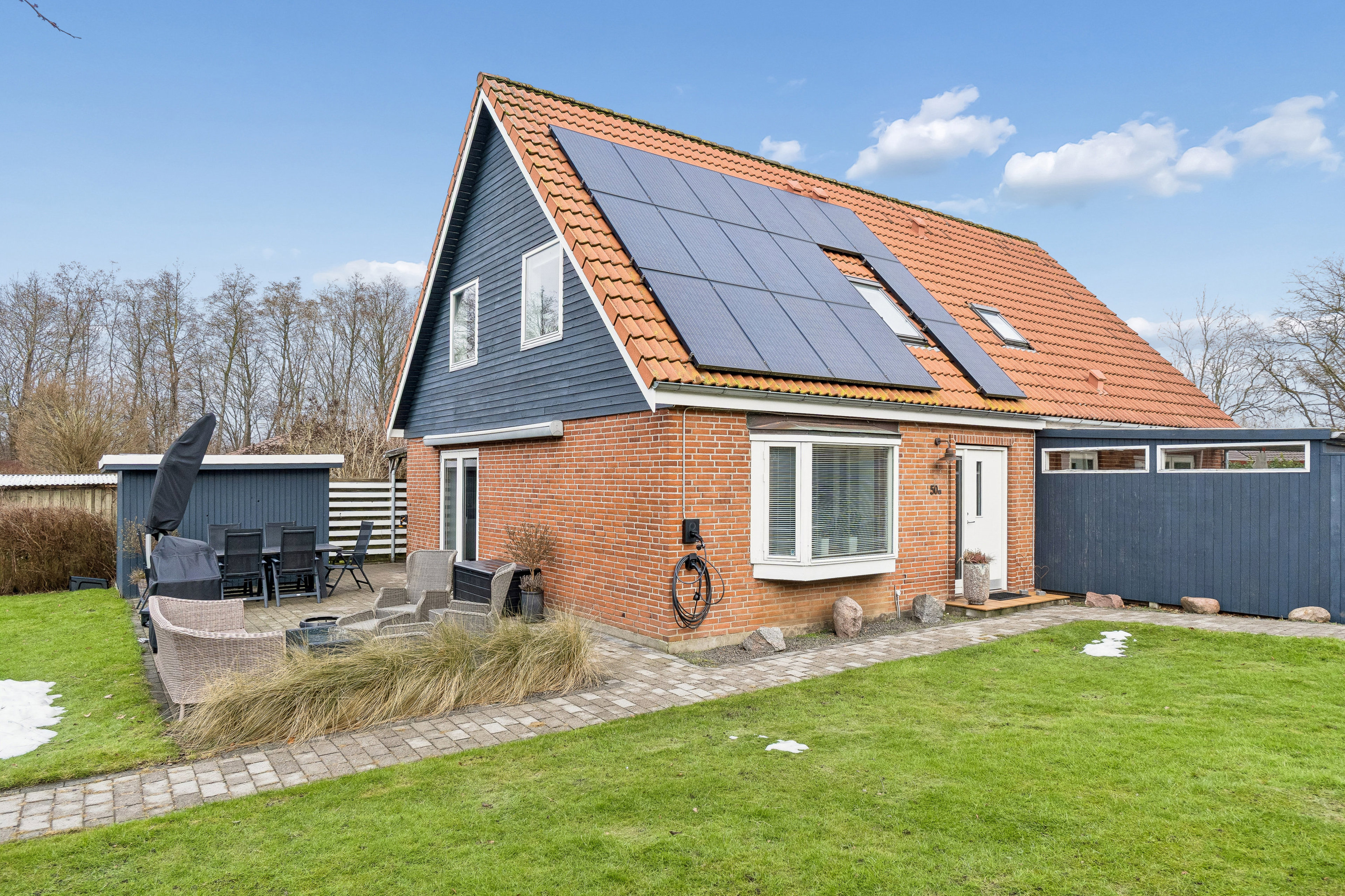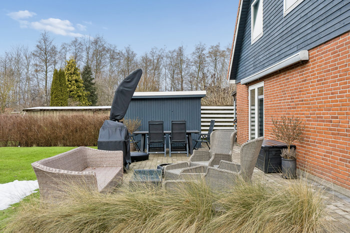 Udendørs venter en hyggelig have med grøn baggrund og plads til leg, afslapning og samvær. I forlængelse heraf er der praktisk parkeringsareal, som fuldender de funktionelle rammer omkring boligen.