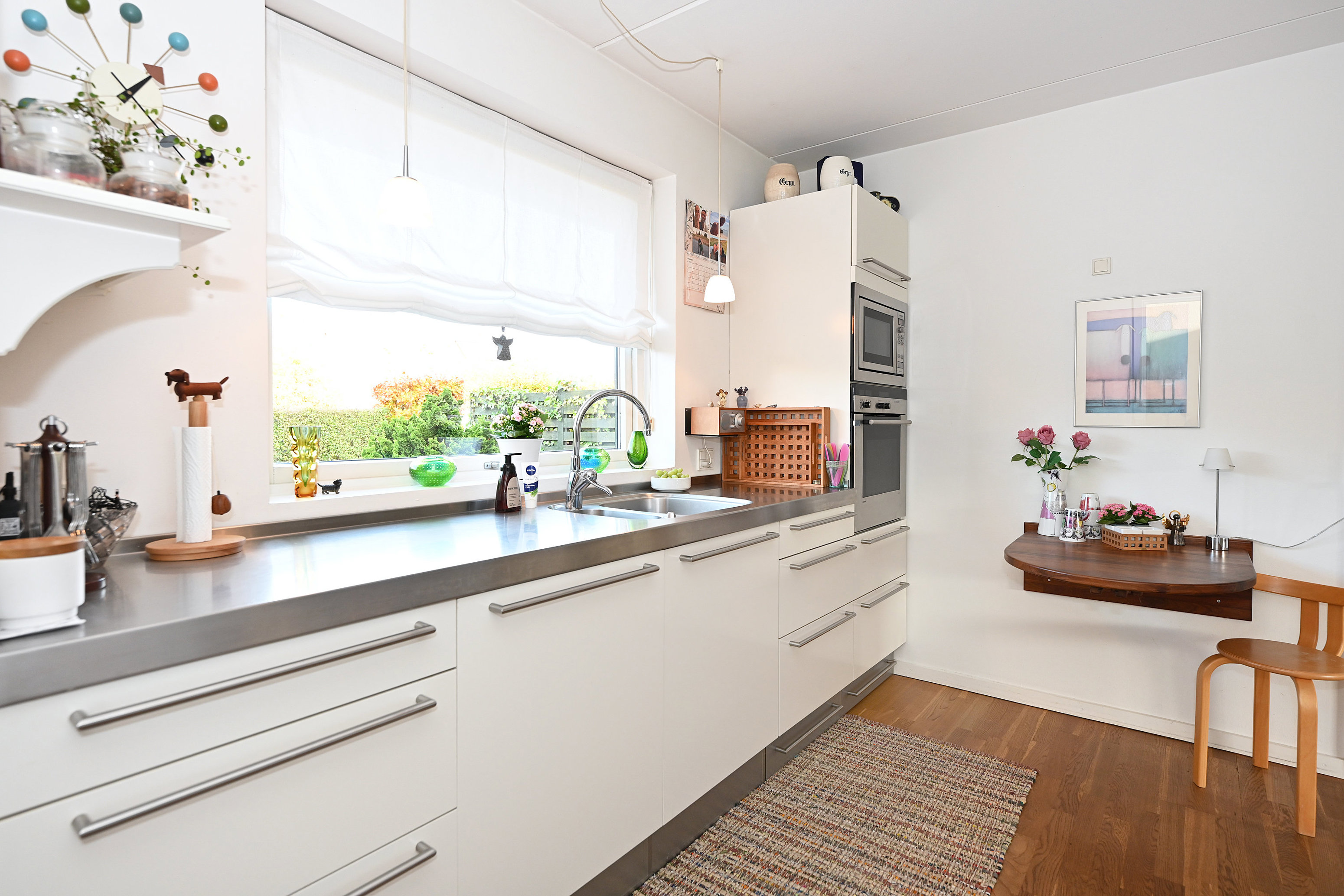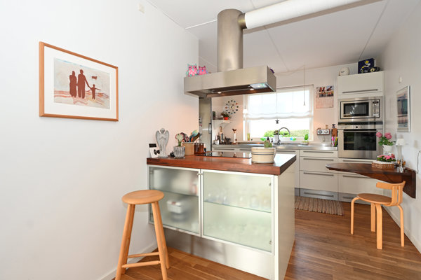 Det flotte hvide HTH-køkken er et naturligt samlingspunkt i hjemmet. Her er god skabsplads, en elegant kogeø og åben forbindelse til den store, lyse stue. Stuen har både plads til spisebordet ved brændeovnen og en hyggelig sofaafdeling med store vinduespartier, der trækker dagslyset ind. Herfra er der udgang til den store og hyggelige havestue, hvor du kan nyde udelivet fra tidligt forår til langt ud på efteråret – og videre ud i den solrige, ugenerede sydvestvendte have.