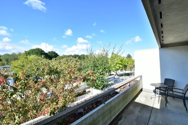 I kan nemt bevæge jer op på rækkehusets 1. sal, hvilket en nydelig vindeltrappe kan føre jer til. Her pryder tre værelser, repos og badeværelse indretningen, hvor værelserne tager sig særligt flot ud. Her får I smukt udsyn til træer, masser af plads at indrette jer på og derudover udgang til en brugbar og stor altan. Det største af værelserne kan opdeles i to værelser, hvis I ønsker fire soveværelser. Selve badeværelset er holdt i et tidløst design og giver jer muligheder for at opbevare alle de nødvendige toiletsager.