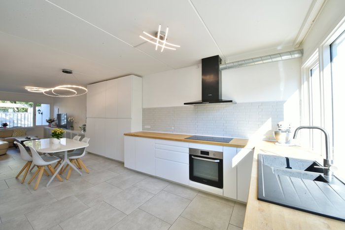 Hjemmet præsenterer sig med en åben entré, der tilgås via husets ene terrasse. Rummet er i åben forbindelse med køkken-alrummet, som præsenterer sig flot med et nyere køkken. I disse moderne og strømlinede omgivelser kan I indrette jer, som I vil, med et stort spisebord og afslappende sofasektioner i den tilstødende opholdsstue. Her skabes der derudover en behagelig atmosfære grundet de store vinduespartier – og så kan I altid bevæge jer ud på terrassen, hvis vejret er til det. Den åbne planløsning og de store vinduespartier giver jer et skønt lysindfald fra morgen til aften.