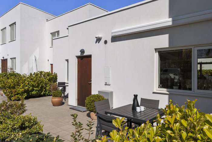 Fra stuen er der direkte udgang til en helt ugenert terrasse med flot stenbelægning og markise – et skønt opholdssted, hvor solen kan nydes i rolige omgivelser. Boligen rummer desuden to gode værelser samt et stort badeværelse med bruseniche.