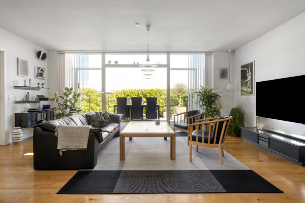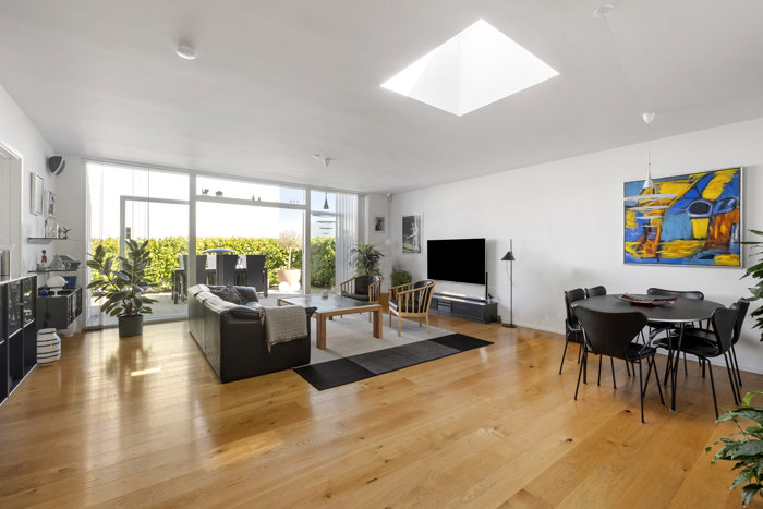Indretningen er både funktionel og indbydende med entré, et praktisk bryggers med vaskesøjle samt gæstetoilet. Hjertet i boligen er den store, lyse opholdsstue med flotte egetræsgulve og imponerende vinduespartier fra gulv til loft, der inviterer lyset indenfor og skaber en skøn forbindelse til udearealerne. Stuen ligger i delvis åben forbindelse med køkkenet, hvilket giver en moderne og social planløsning.