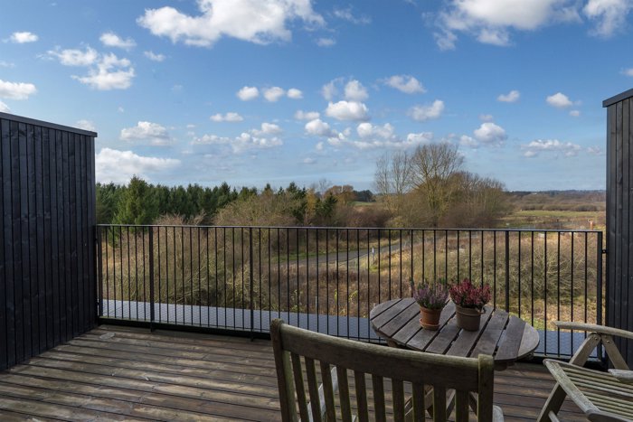 Øverste etage er et sandt fristed: En lys og luftig stue leder ud til den private tagterrasse, hvor panoramaudsigten over de grønne områder og de spektakulære solnedgange mod vest skaber en helt særlig stemning. Her kan du nyde roen, naturen og sommeraftenerne i fulde drag. Der er endda mulighed for at indrette et ekstra stort værelse heroppe, hvis behovet skulle opstå. Se alternativ plantegning.