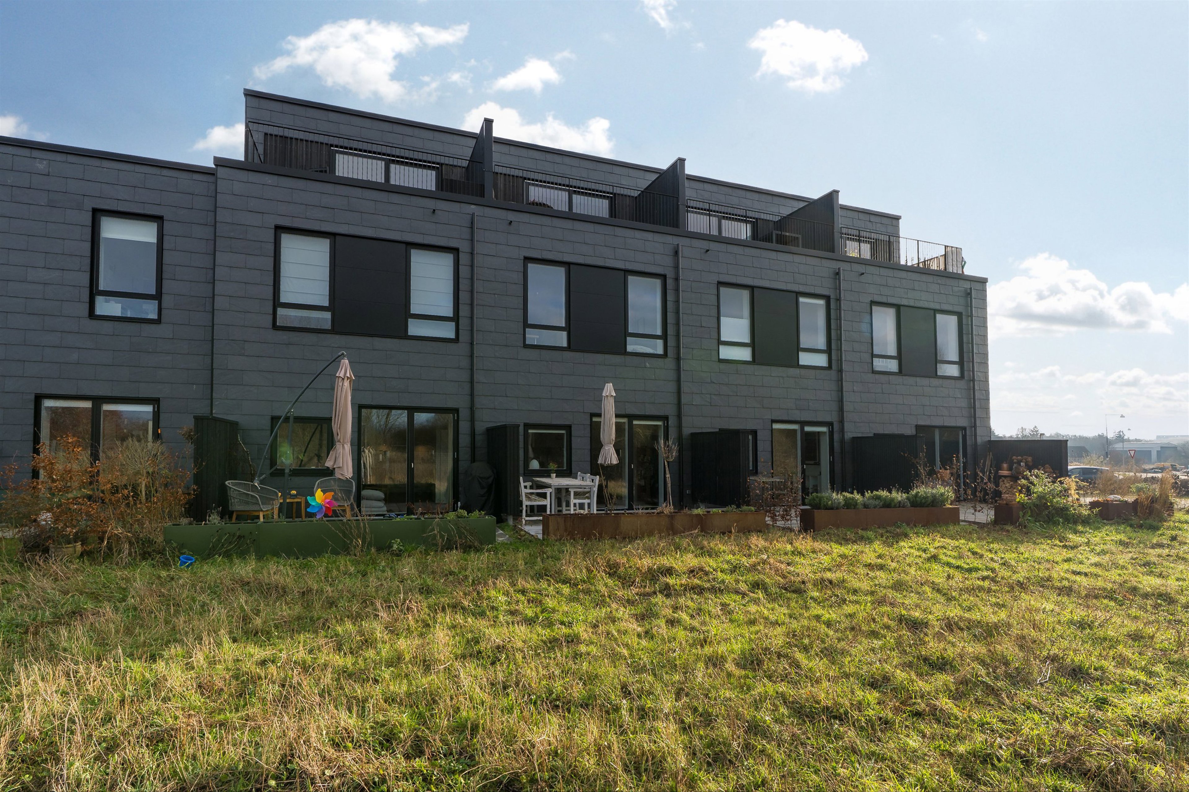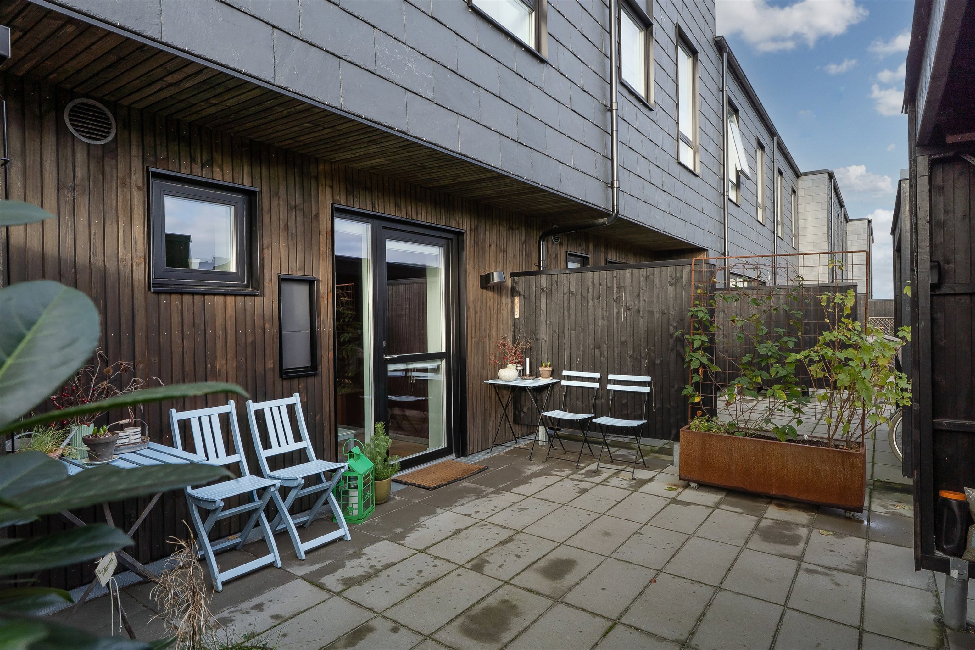 Sydvestvendt terrasse, gårdhave og privat tagterrasse. Byggeriet er Svanemærket.