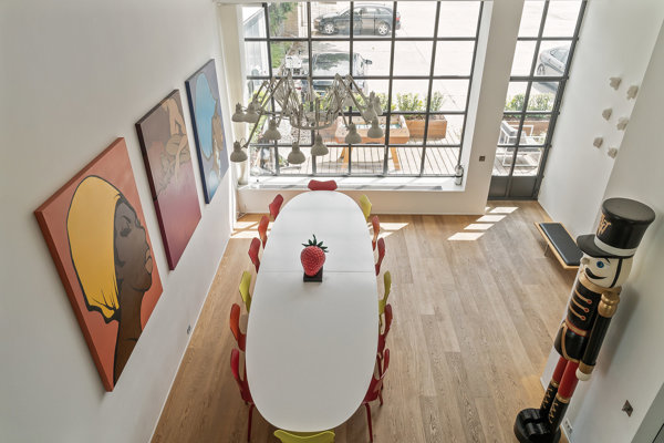 Fra det øjeblik du træder ind, mødes du af boligens ikoniske leverum: et fantastisk åbent opholdsrum med himmelstræbende loftshøjde, massivt lysindfald og den smukke, sorte stålspiraltrappe, der elegant binder etagerne sammen. Her er atmosfæren helt særlig - moderne, kreativ og kompromisløs.