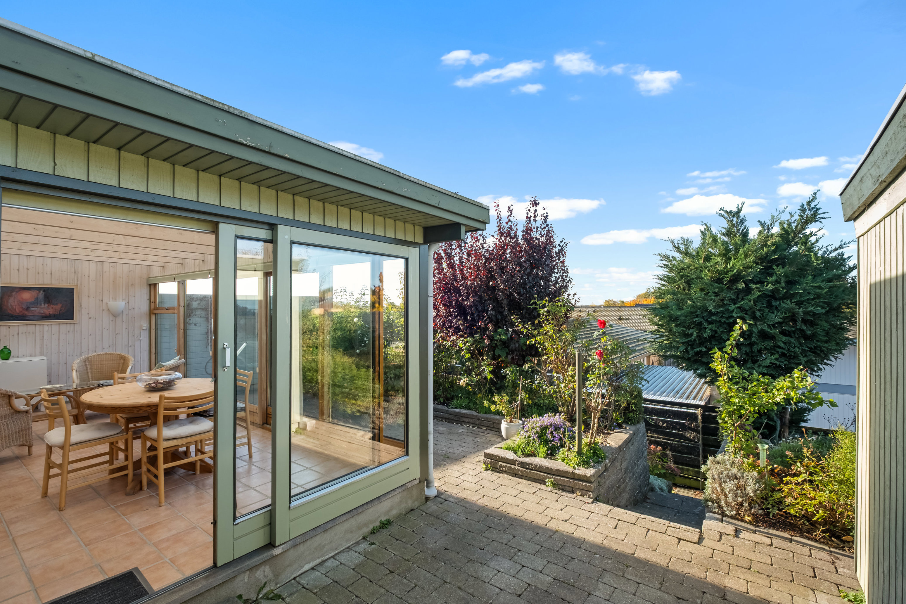 Fra stuen kommer I videre til den store, flotte udestue, der er indbydende på alle årstider. I udestuen og