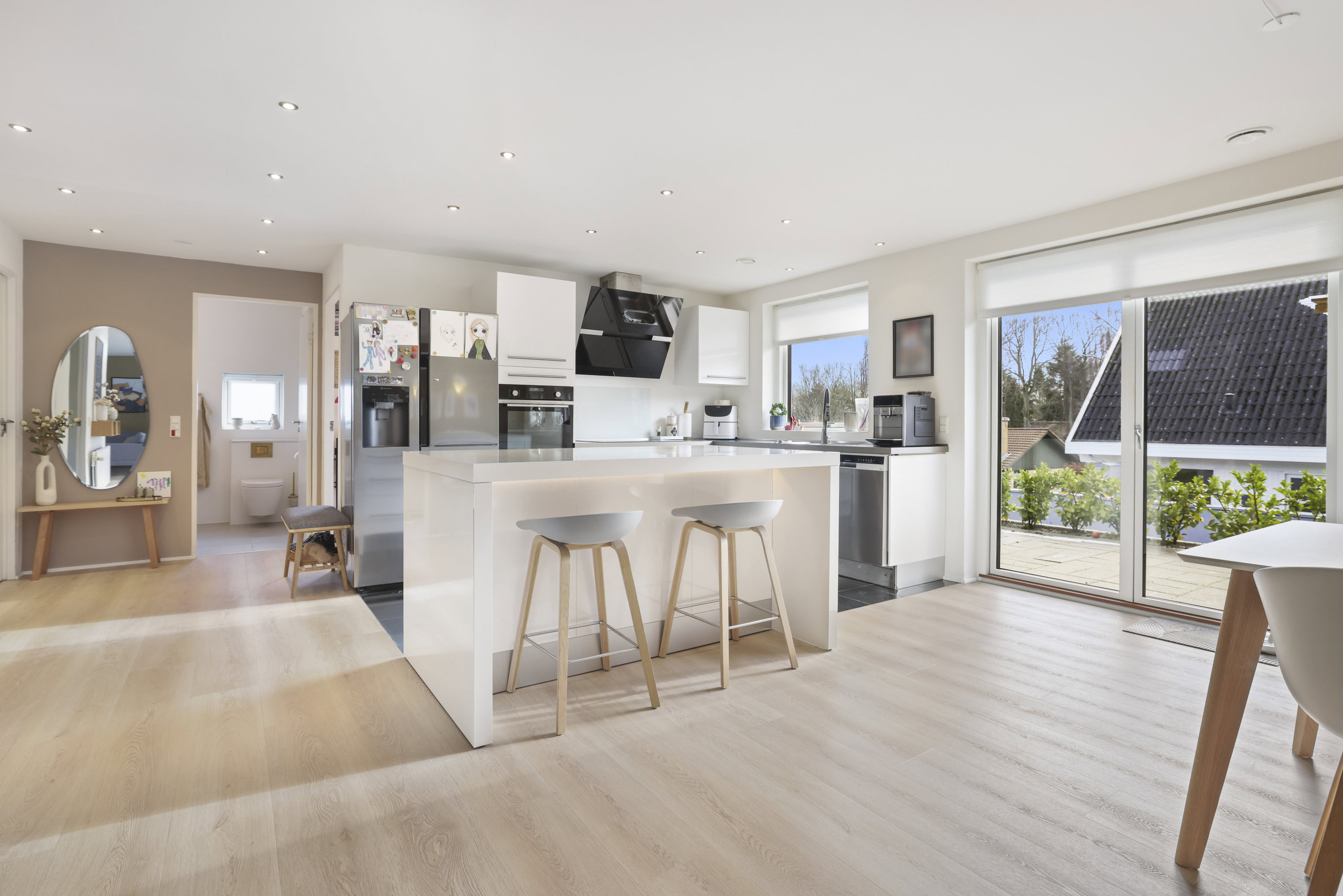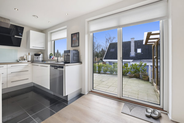 Køkkenet ligger i åben forbindelse med opholdsrummet og fremstår stilrent med hvide fronter, lyse bordplader og integrerede hårde hvidevarer. Køkkenøen skaber en elegant og naturlig overgang mellem madlavning og samvær og giver både ekstra arbejdsplads og en hyggelig plads til morgenkaffen. Her er der fokus på både funktionalitet og æstetik i en harmonisk helhed.