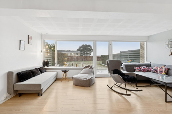 I forlængelse af alrummet ligger stuen, hvor der er plads til afslapning og samvær. Herfra er der direkte udgang til den sydvestvendte have, som giver gode solforhold dagen igennem. Haven er overskuelig og nem at holde og indbyder til udeliv, uanset om det er leg på græsset, en rolig stund på terrassen eller aftensmad under åben himmel.