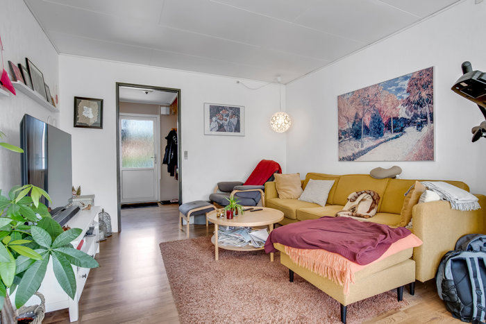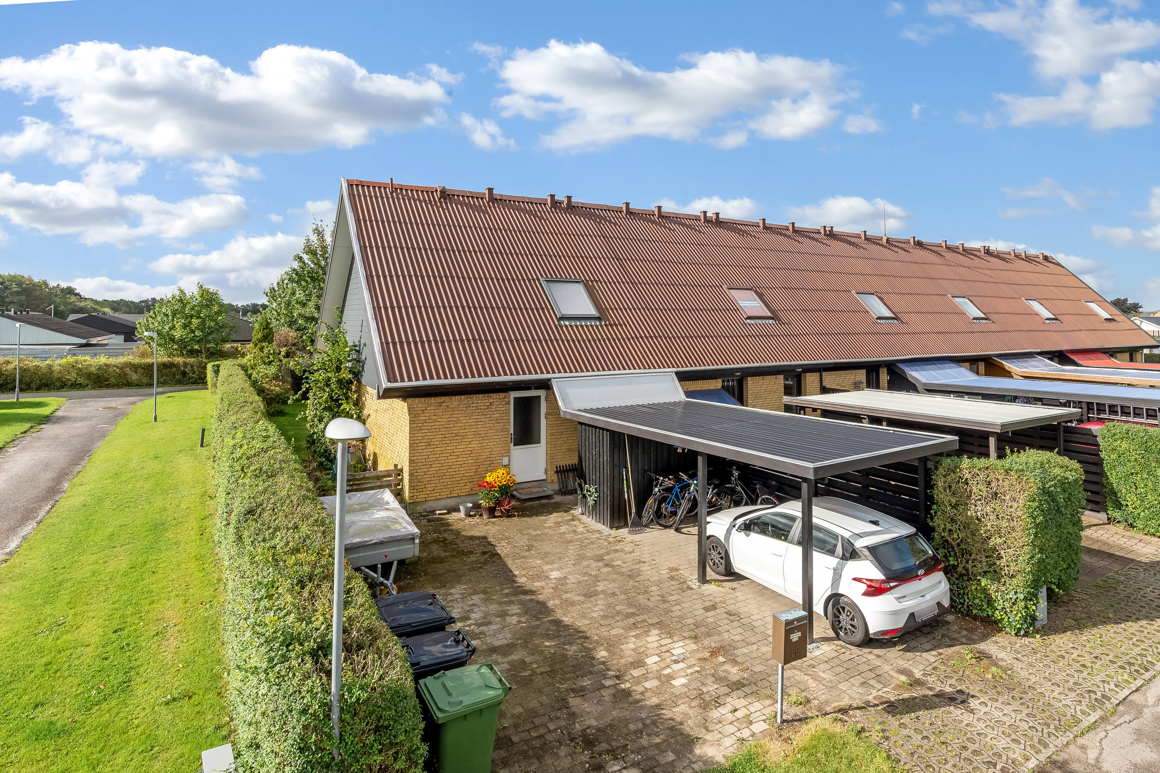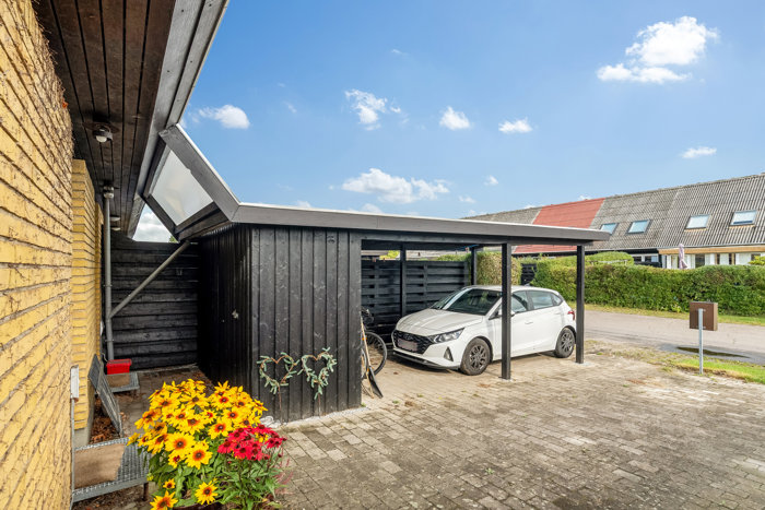 På en rolig villavej i et børnevenligt kvarter i Holstebro finder du dette indbydende rækkehus, der med sin funktionelle planløsning, fine udearealer og carport byder sig til som en oplagt base for både den lille familie, det unge par eller dig, der ønsker en overskuelig bolig i gode omgivelser. Huset er opført i 1977 i klassiske materialer med gule mursten og stærkt eternit tag, og ankomsten sker via en privat indkørsel med egen carport og integreret redskabsrum – praktisk og bekvemt i hverdagen. Hoveddøren er placeret let tilbagetrukket under overdækning, hvilket både skaber læ og en velkommen stemning allerede ved ankomst.