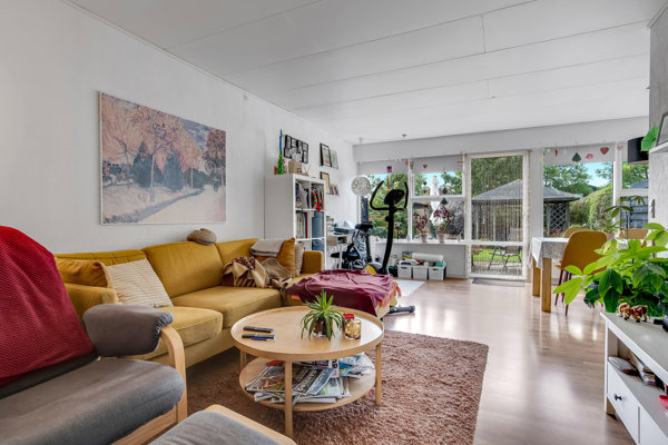 Indenfor breder boligen sig over 100 veludnyttede kvadratmeter fordelt på to plan. Stueetagen åbner sig med en entré, gæstetoilet og et funktionelt bryggers, som er særligt anvendeligt til hverdagens praktiske gøremål. Herfra bevæger man sig videre ind i boligens naturlige samlingspunkt – det åbne køkken-alrum og stue, der ligger i forlængelse af hinanden. Køkkenet fremstår moderne og lyst med hvide fronter, god skabsplads og alt i nødvendige hårde hvidevarer. Opholdsstuen har en dejlig rummelighed og store vinduespartier, der giver et flot kig ud til haven og sikrer masser af dagslys. Der er fin plads til både spisebord og sofagruppe, og døren ud til terrassen inviterer til let udeliv.