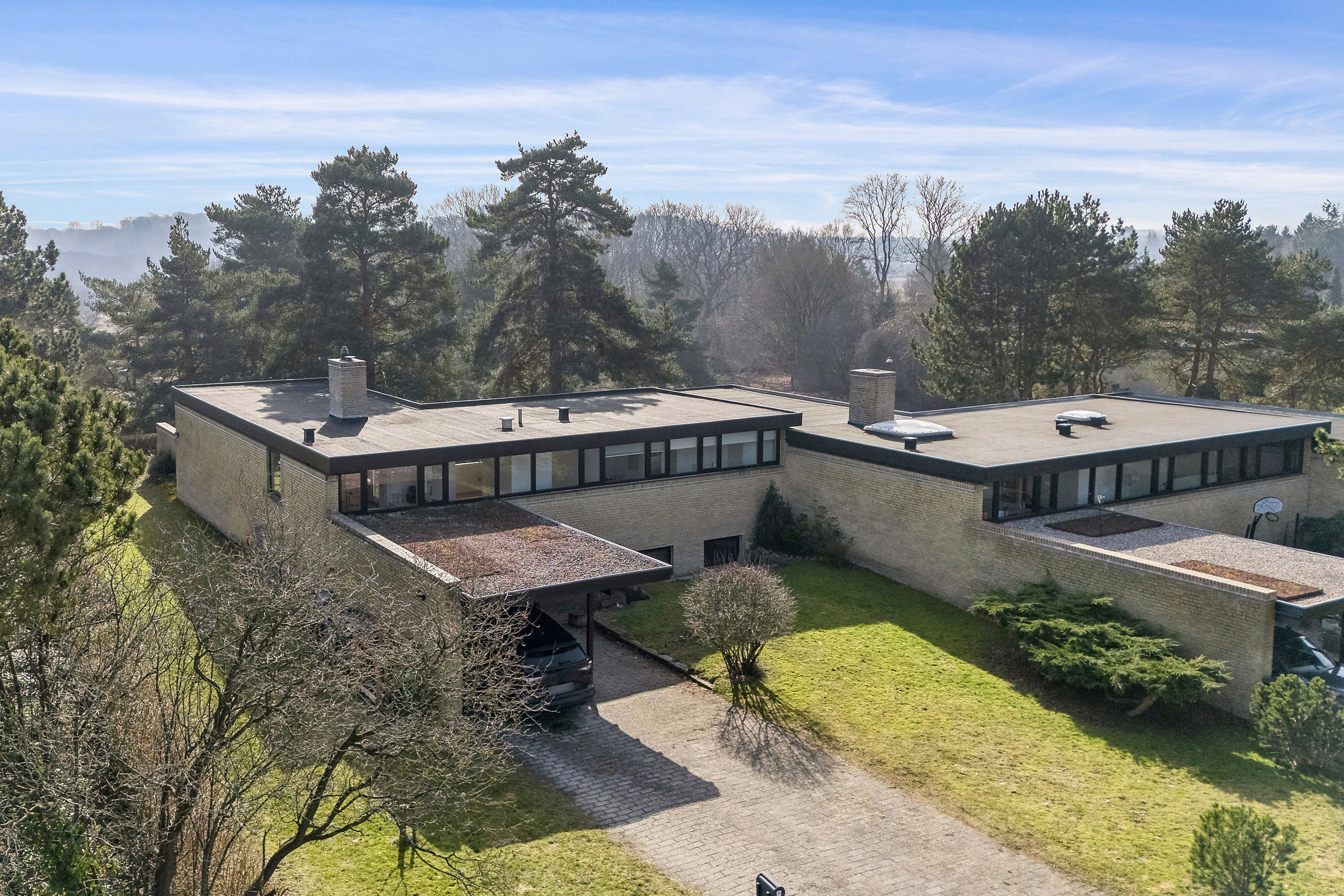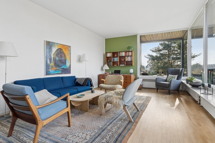 Sådan blev Henrikshave til i 1966. En lille forening med blot 29 rækkehuse, nænsomt placeret i et kuperet naturterræn mellem skov, søer og Øresundskysten. De karakteristiske gule mursten og de flade tage giver bebyggelsen et roligt, tidstypisk udtryk, der stadig føles både elegant og moderne. Husene ligger diskret i landskabet, næsten som små udsigtsposter over naturen. Og netop her, øverst og for enden af vænget, ligger måske den bedst placerede bolig af dem alle.