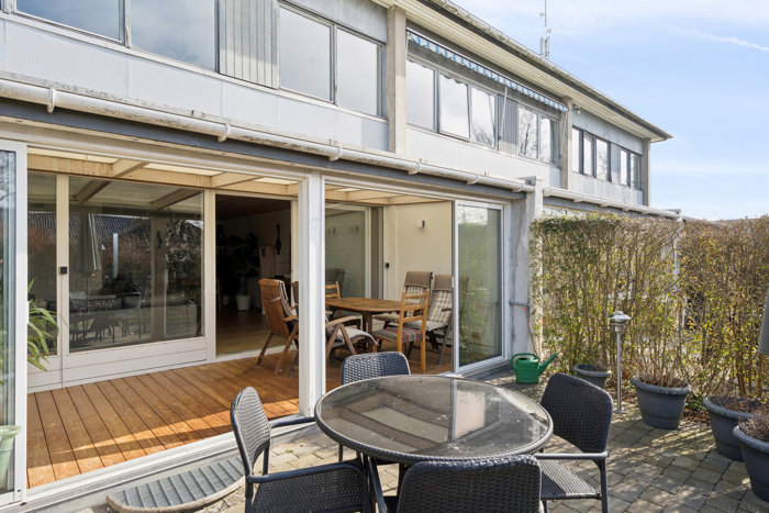 Udenfor kan I nyde livet på de to terrasser, der er placeret på hver sin side af huset. Den sydvendte terrasse og den tilhørende have inviterer til afslapning i solen, mens de praktiske behov opfyldes af både et redskabsrum og et ekstra skur foran boligen.