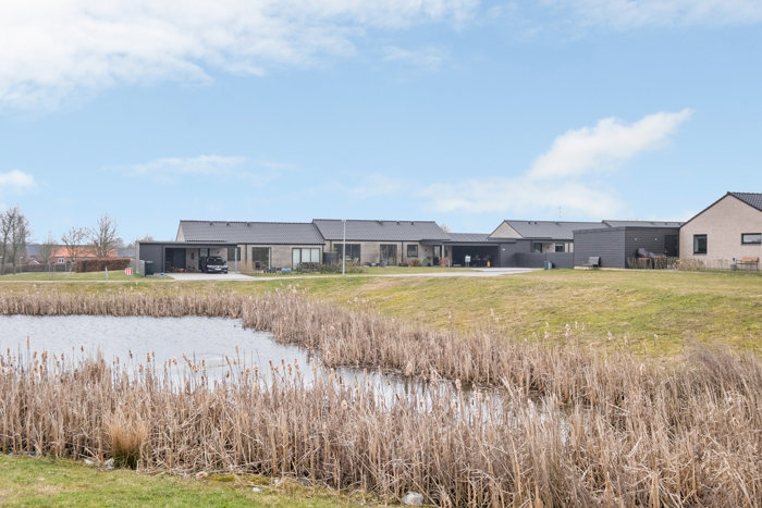 For enden af den lukkede vej finder du dette velplacerede dobbelthus. Som det næstsidste hus på vejen får du en særlig ro og frihed, da der ikke er naboer på den modsatte side. Det giver et skønt lysindfald og en dejlig følelse af luft og plads. Samtidig har du udsigt til den lille sø på den anden side af vejen – en hyggelig oase, hvor du kan nyde synet af fugle og ænder, der holder til ved vandet.