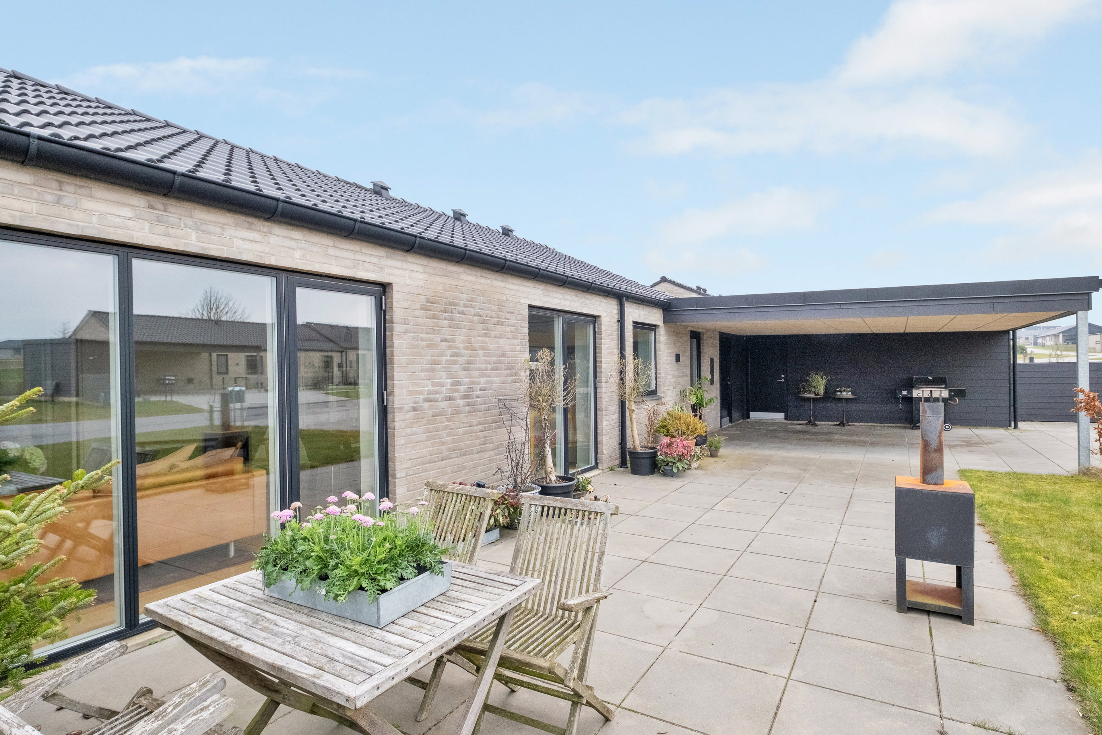 Ved ankomst mødes du af en bred indkørsel med carport, så bilen kan holde i tørvejr. Det gør hverdagen nemmere – ikke mindst på de kolde vintermorgener, hvor du slipper for at skrabe is og sne af bilen.