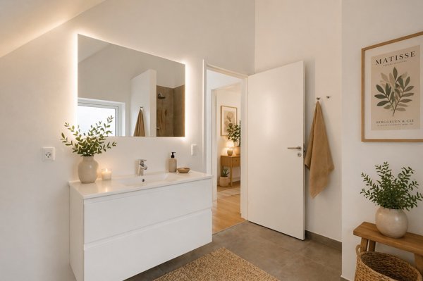 Boligens naturlige samlingspunkt er det lyse og indbydende køkken/alrum med hvide elementer fra HTH og god spiseplads til hele familien. Herfra er der åben forbindelse til opholdsstuen, hvor de store gulv-til-loft vinduespartier sikrer et flot lysindfald og direkte udgang til egen terrasse.
