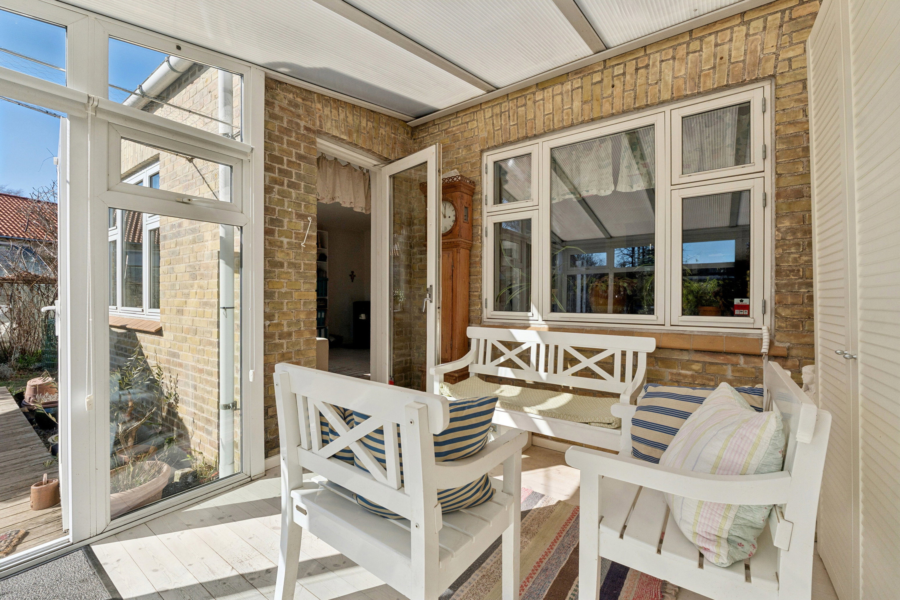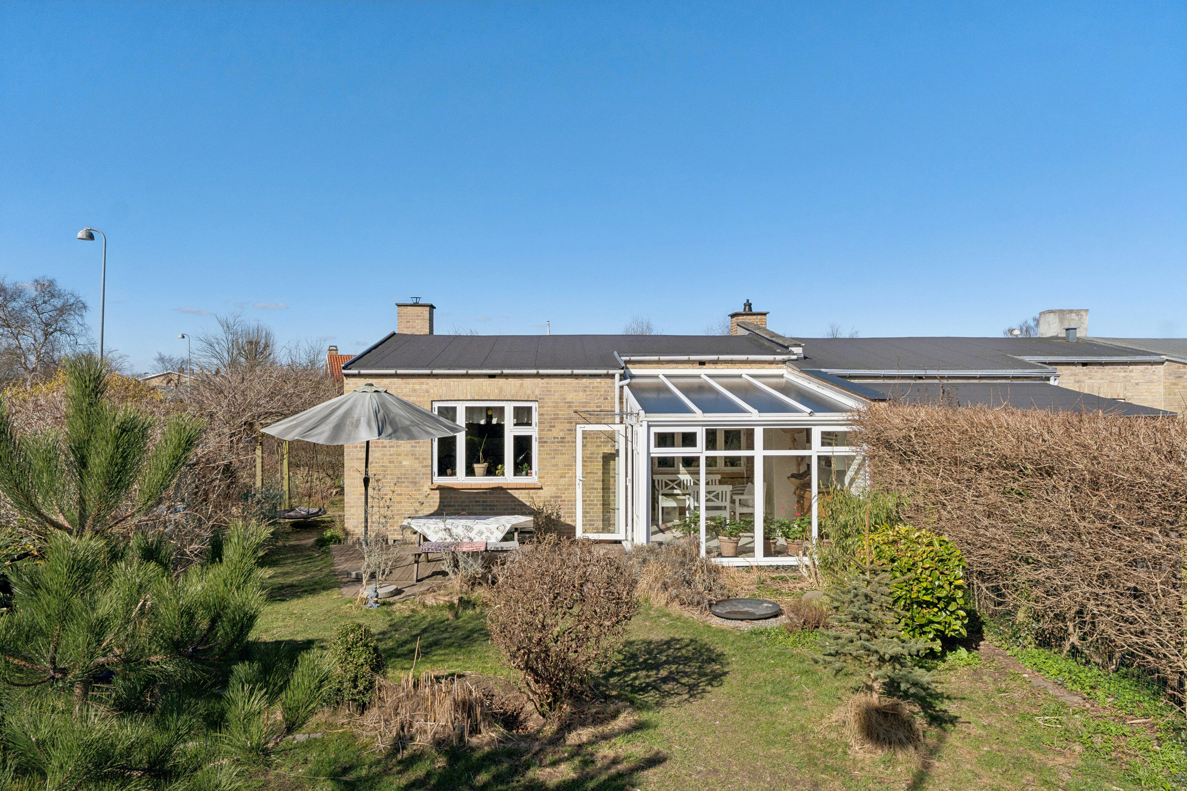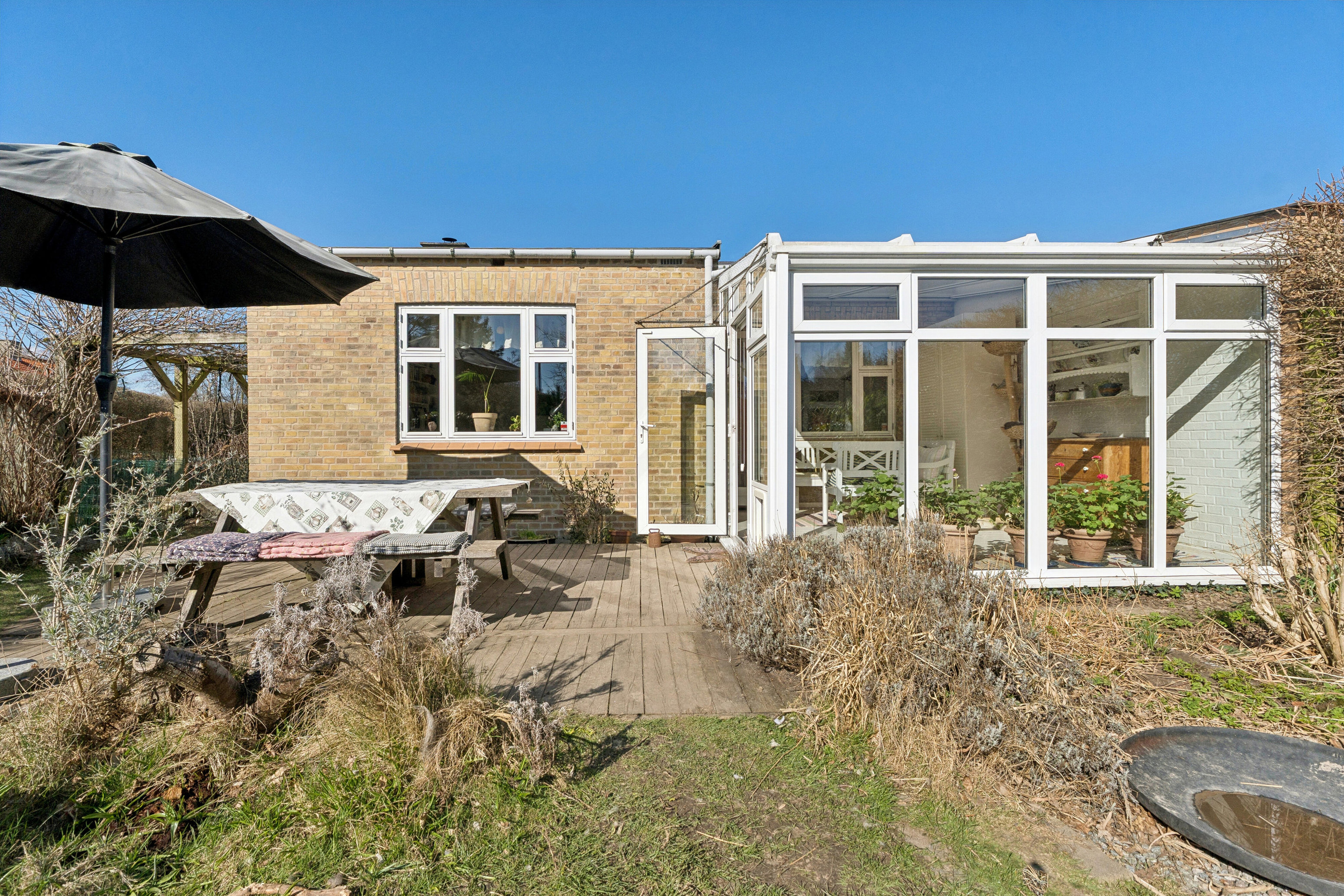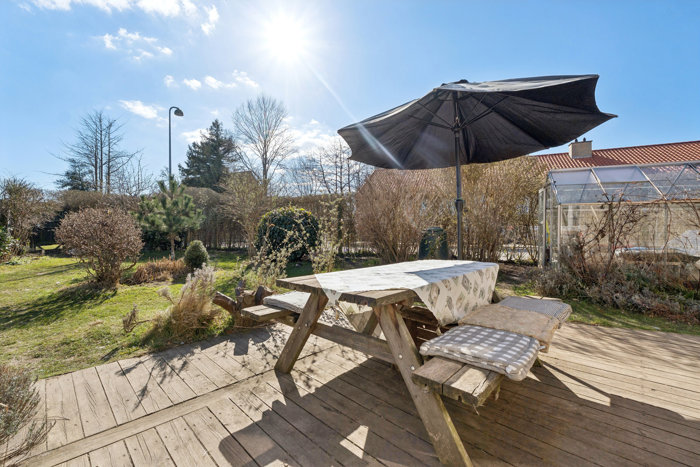 Haven: En tydelig fordel ved dette hus sammenlignet med rækkehuse er, at det er et enderækkehus. Det giver en bredere og mere regulær grund med blandt andet indkørsel bagerst i haven og mulighed for at gå hele vejen rundt om huset udefra. Samtidig er baghaven mere funktionel og anvendelig end hos de fleste sammenlignelige rækkehuse. En sydvendt have, der er en ægte oase med træterrasse, drivhus, hyggekroge og masser af sol. Fra forhaven har I adgang til indgangen til grundejerforeningens fælles legeplads – helt genialt for familien med børn.