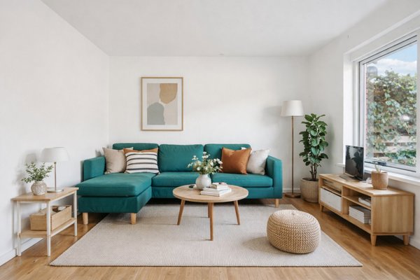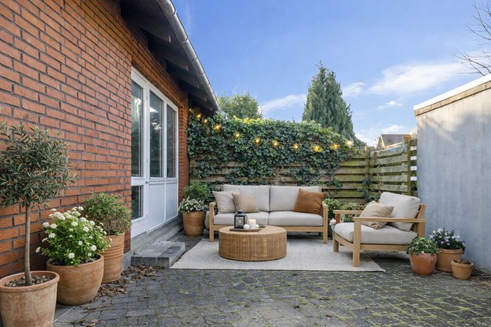 Til højre for værelset ligger det sammenlagte stueareal, som tilbyder fleksible indretningsmuligheder med plads til både sofamøblement, spiseplads eller anden indretning efter behov. Fra stuen er der direkte udgang til et bekvemt flisebelagt udeareal.