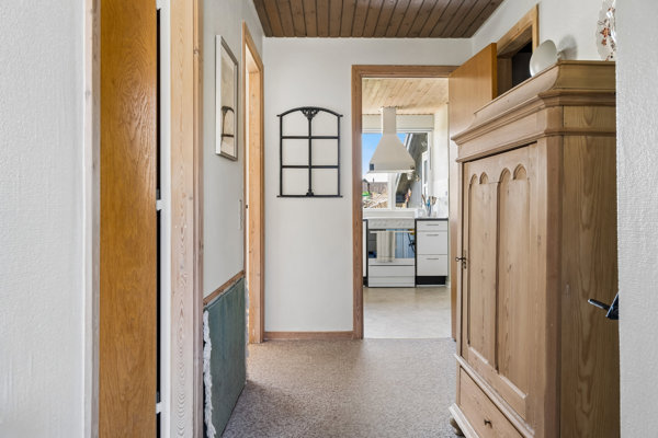 Videre fremme i boligen ligger køkkenet, som fremstår velholdt med gode arbejds- og opbevaringsmuligheder. Herfra er der direkte adgang til et praktisk bryggers med plads til vaskefaciliteter og ekstra opbevaring.