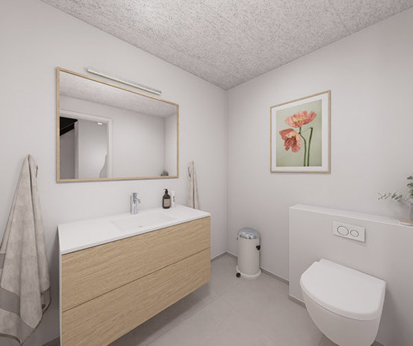 Alle boligerne er fordelt over to plan, hvor leverummene og soveværelset er på første sal og alle øvrige værelser i stueplan. Du bliver budt indenfor i entreen, med adgang til husets bryggers, hvor også vaskefaciliteterne er, fra fordelingsgangen får du adgang til det ene af boligens badeværelser, gangen giver tillige adgang til tre gode værelser, så der er plads til alle i familien.