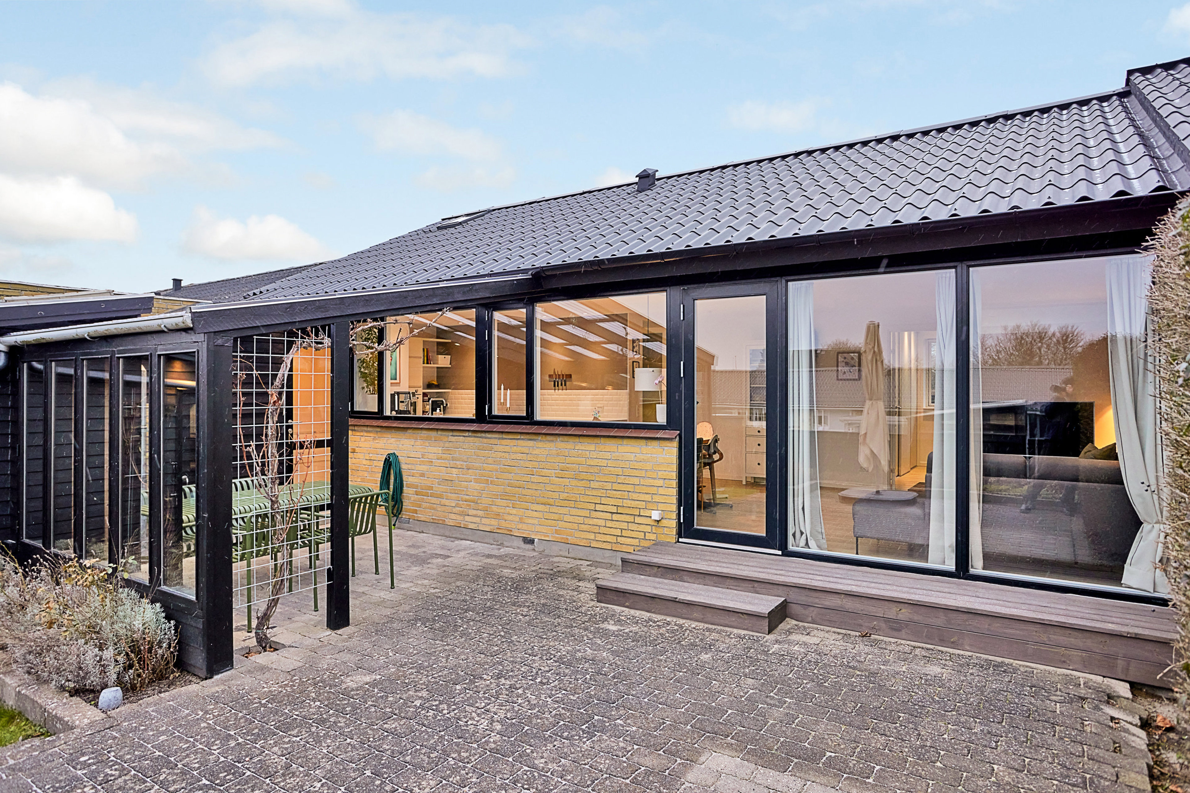 Det hyggelige udemiljø byder på en lækker træterrasse med overdækning, græsplæne og orangeri.