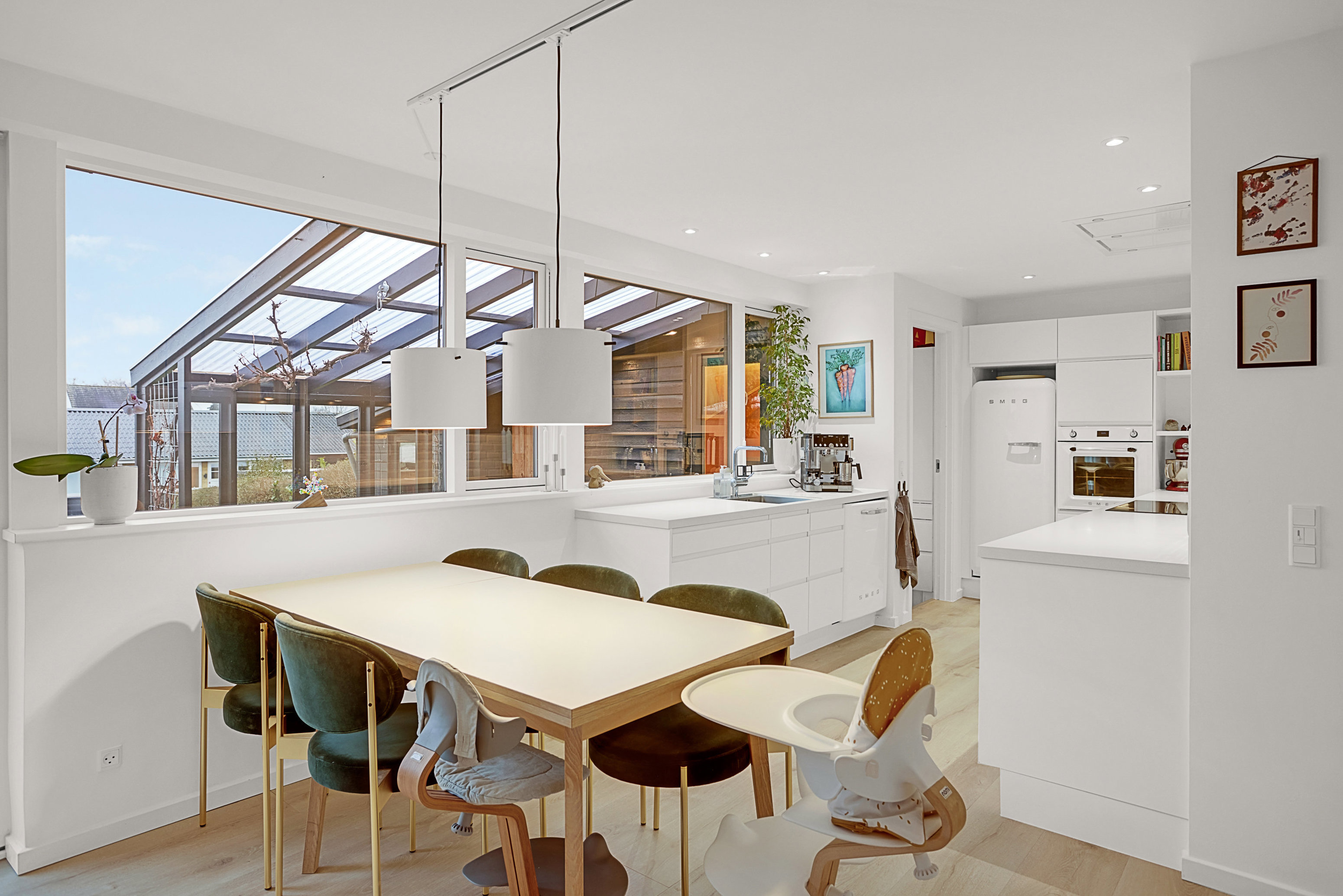 Det lækre Nettoline-køkken med hvide, grebsfri elementer ligger i åben forbindelse med stuen og skaber et skønt opholdsrum med et dejligt lysindfald fra de mange vinduer mod haven.