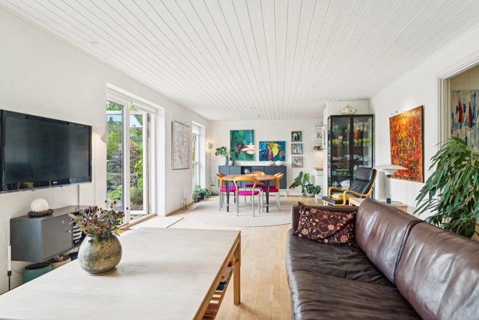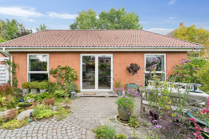 Planløsningen byder to regulære soveværelser. Lyst og funktionelt køkken med god opbevaringsplads. I åben forbindelse hermed er stor, hyggelig spise-/opholdsstue med dejligt lysindfald fra de store vinduespartier ud mod terrassen og haven. Her er masser af plads og oplagt mulighed for at lave TV-/sofakrog i den ene ende samt spiseafdeling i den anden. Dertil et rummeligt badeværelse med toilet, vask og bruseniche. Herudover to adgange til boligen i form af henholdsvis gæsteentré og bryggers med vaskefaciliteter og gode opbevaringsmuligheder. I direkte udgang fra stuen kommer man ud på den skønne, flisebelagte terrasse og dejlige have, som man har brugsret til! Alt ligger orienteret mod syd, hvilket sikrer, at der er mulighed for at fange solen fra morgen til aften. Her får I rolige, private og afskærmede omgivelser med bede og et skønt drivhus.
