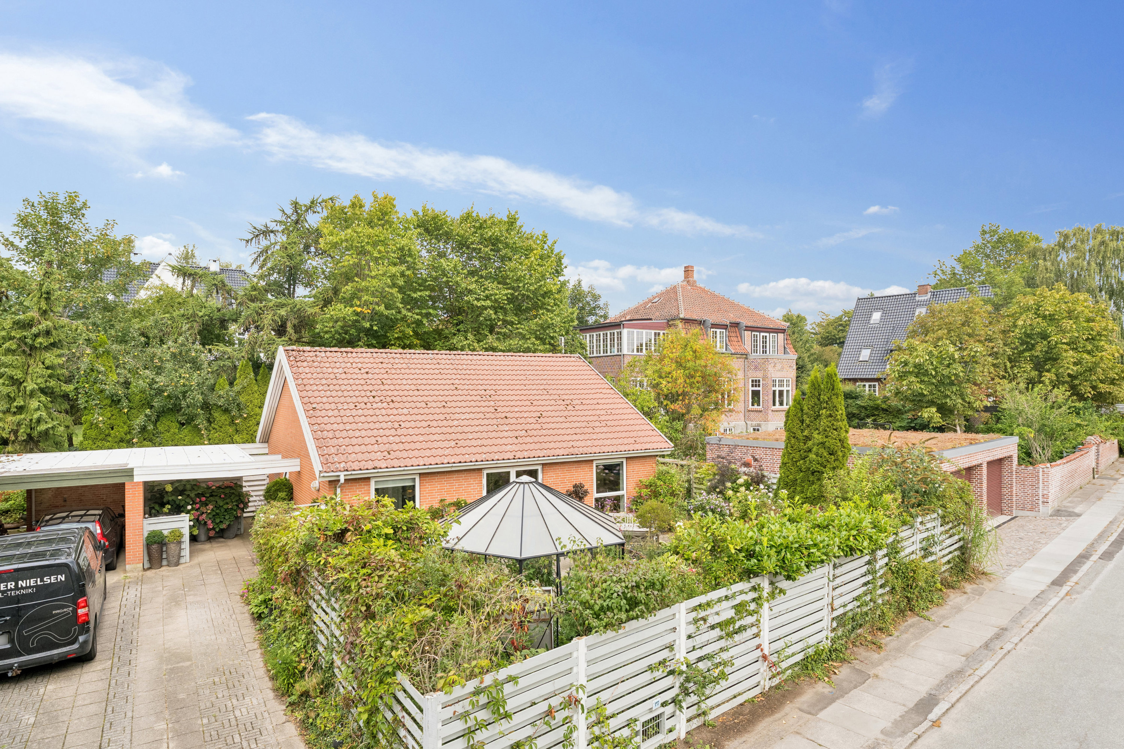 Slutteligt skal det nævnes, at der på ejendommen er indkørsel til carport samt godt udhus/skur i forlængelse heraf med god mulighed for opbevaring af haveredskaber, grill, værktøj, vinterdæk osv.
