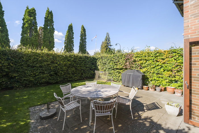 Haven ligger foran stuen og får om sommeren sol til sent på aftenen. Den er nem at holde, for det er kun græsset, der skal trimmes i ny og næ, og da haven derudover er lukket af en opvokset hæk, kan I sidde privat uden at skulle bekymre jer om nysgerrige blikke. På grunden er der plads til parkering og lige foran huset får I en privat parkeringsplads. Desuden et isoleret skur til cykler og opbevaring.
