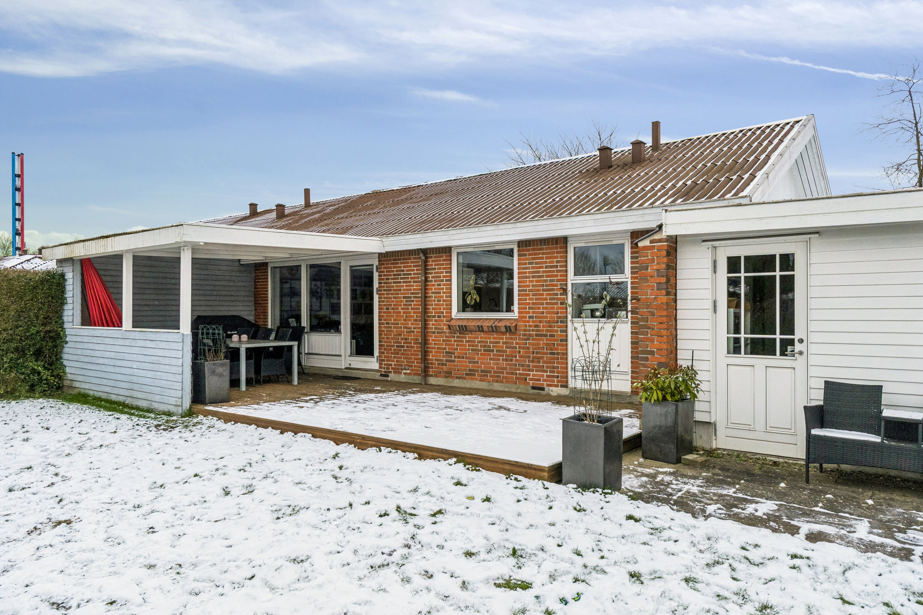 Udendørs findes en dejlig træterrasse med overdækning, der skaber gode rammer for udeliv det meste af året. Haven er overskuelig og nem at holde, samtidig med at der er god plads til leg og afslapning.