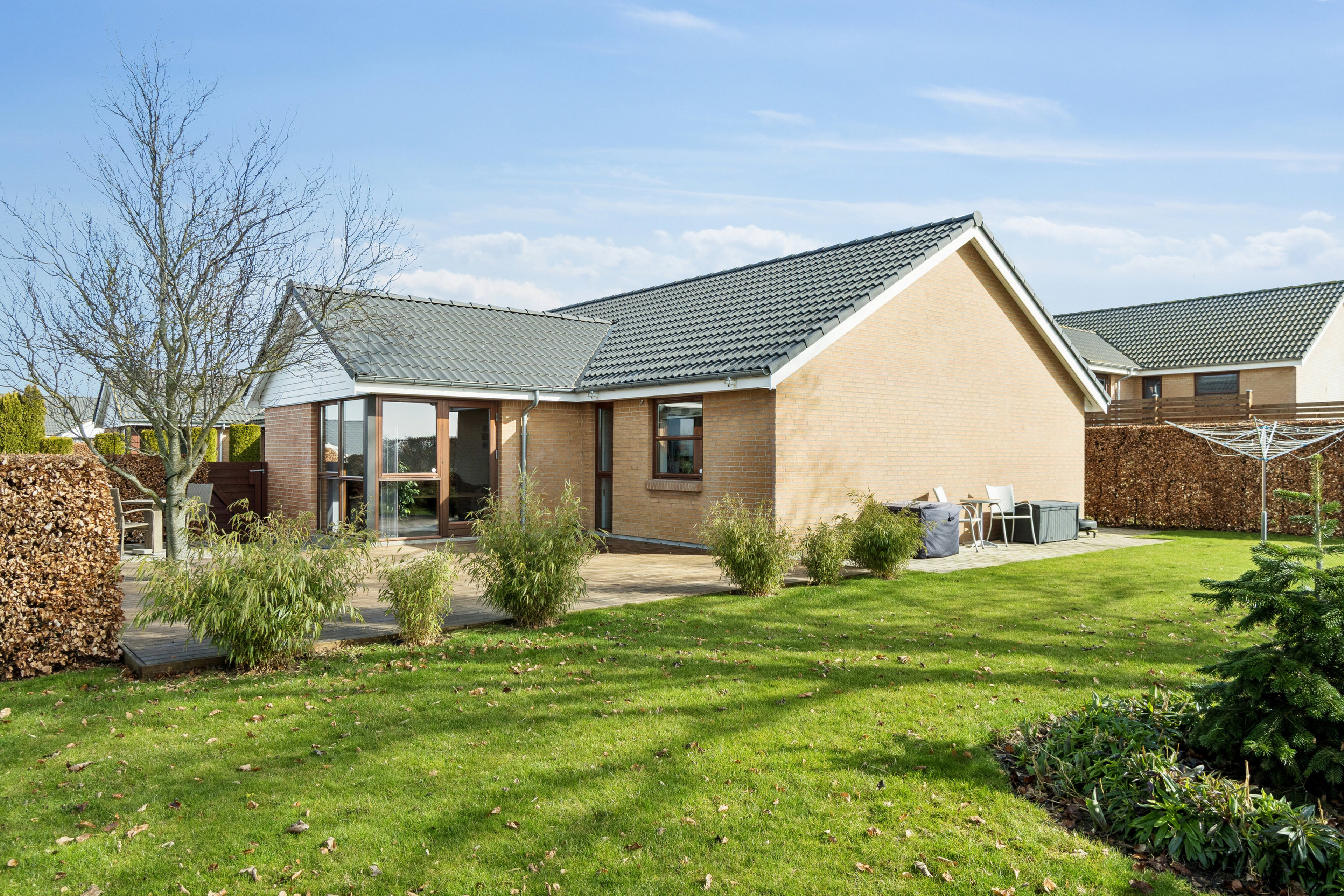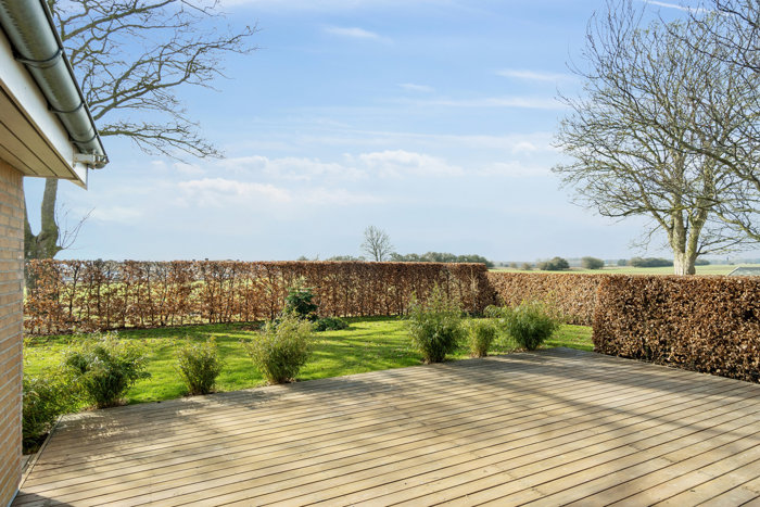 sommerhalvåret. Den hyggelige have med en skøn træterrasse, der indbyder til frokost under åben himmel.