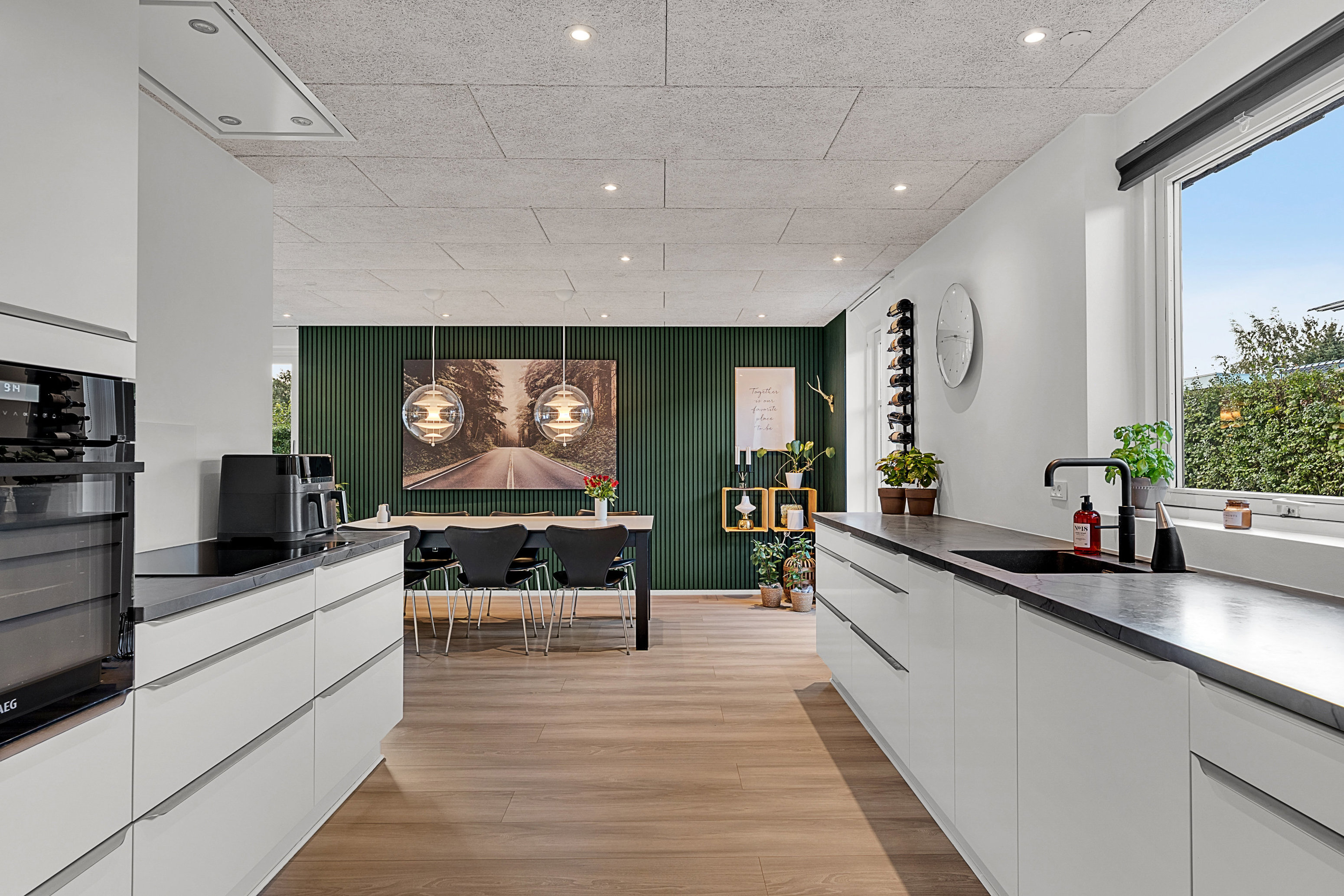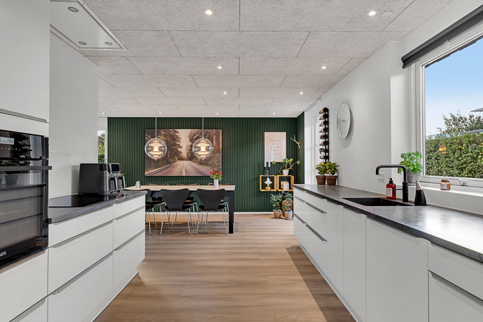 Centralt køkken/alrum i åben forbindelse med flot lyst køkken med masser af skabs- og bordplads. Fra køkkenafsnit er der udgang til terrasse mod vest. Fra alrum er der udgang til skøn træterrasse mod syd.