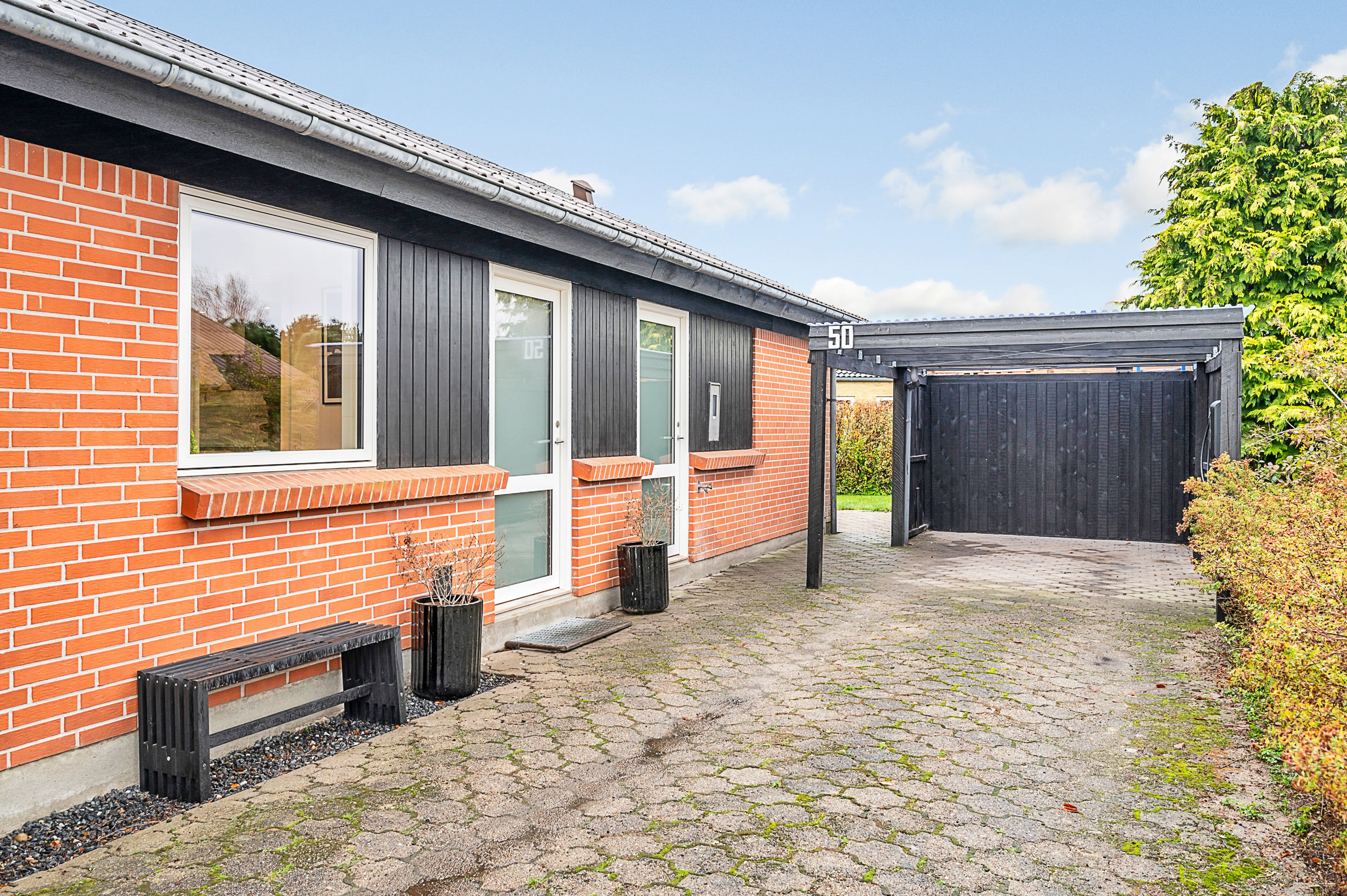Nem, sydvestvendt have og praktisk carport