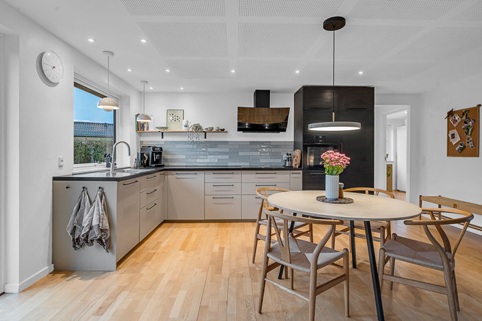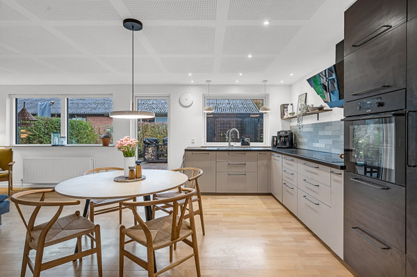 Alt er renoveret inden for det seneste par år – bl.a. er lofter, vægge, elinstallationer, køkken, bryggers og badeværelse fornyet, mens hoveddøre og vinduer blev skiftet i 2022 med 3-lags termoruder. Stilen er moderne og gennemført, og i alrummet er der akustikfelter i loftet, som giver en behagelig lydoplevelse. Køkkenet er et stilrent IKEA-køkken fra samme design linje som bryggerset.
