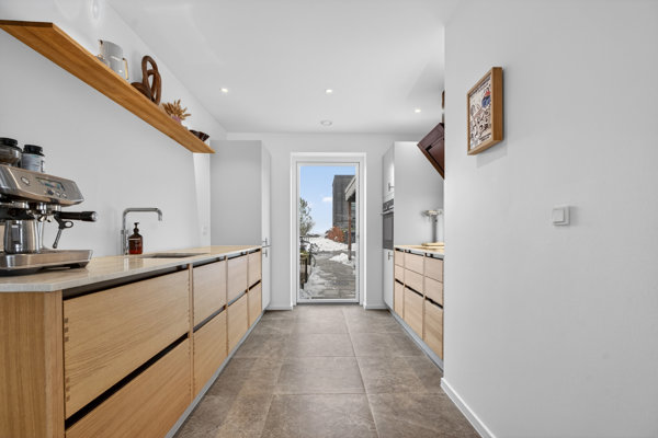 Især i stueplan træder de mange tilvalg i karakter, og det moderne snit bliver balanceret af et varmt strejf. Det skyldes blandt andet de elegante, gennemgående gulvfliser i hele opholdsafdelingen, ligesom de massive elementer i egetræ er et smukt valg i køkkenet. Disse toppes af en holdbar bordplade i Quartzite, og bemærk, at kogepladen er planlimet. Desuden er der gulvvarme i alle rum, og I får et rum til opbevaring under trappen.