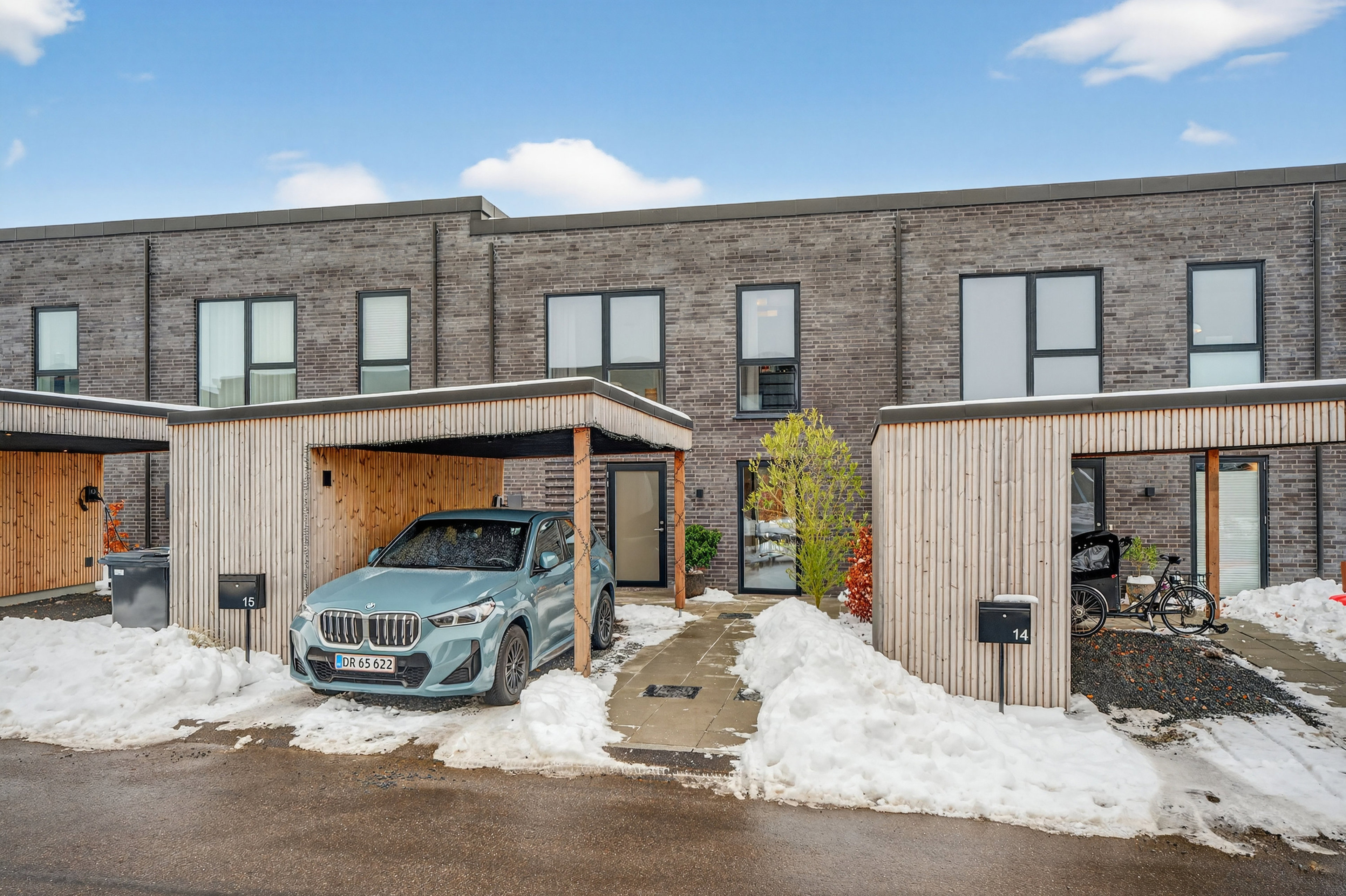 Rækkehuset har store vinduespartier og en afdæmpet fremtoning, som komplementeres nydeligt af carporten i træ. Denne optager en del af forhaven, hvor I dog alligevel har fin plads til en hyggekrog i aftensolen, inden baghaven byder ind med en stor fliseterrasse og en overskuelig græsplæne.