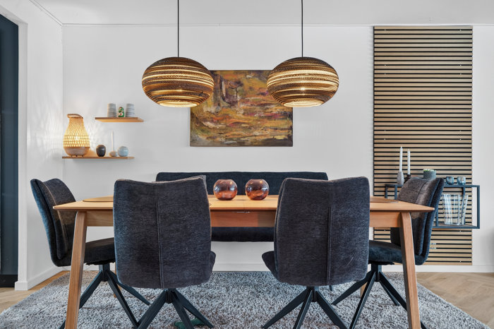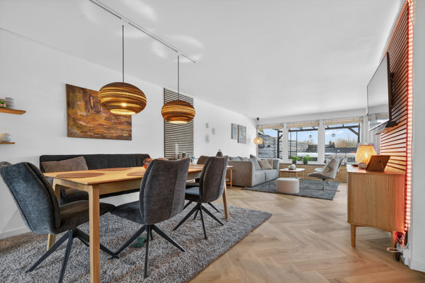 Hvad renoveringerne angår, har man været hele vejen rundt. Man har gjort systematisk brug af fine trælister, som virkelig gør stemningen en tjeneste på tværs af huset. Læg dertil strømlinede opdateringer af vådrummene, hvor særligt badeværelset og gæstetoilettet fremstår ensartede og i meget indbydende stand. Køkken-alrummet og stuen flyder sammen i ét stort opholdsmiljø, og også her er resultatet vellykket. Således præsenterer køkkenet sig med grebsfri elementer i hvide og matsorte komplementærfarver, mens hele afdelingen er belagt med et slidstærkt gulv i flot sildebensmønster.