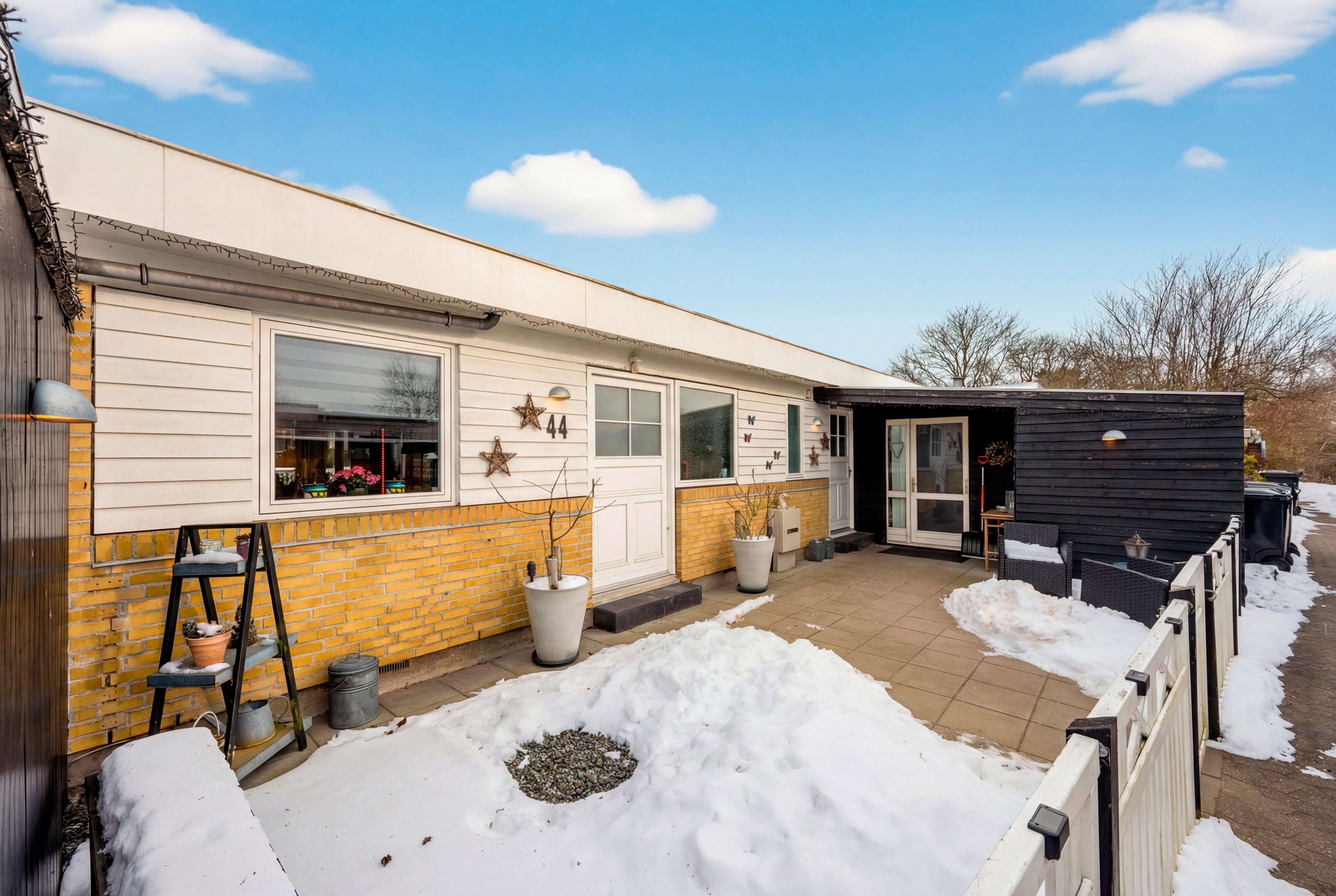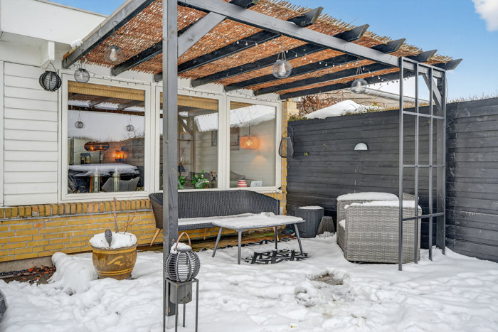 Hører I til dem, der lever udendørs hele sommeren, har vi flere gode nyheder. Haven er nemlig indrettet med masser af uderum, der veksler mellem både overdækkede og lukkede terrasser til åbne haverum, hvor den sydvendte orientering kommer jer til gode. Selv et indhegnet poolmiljø har man fundet plads til, og via havelågen får I direkte udgang til parkeringspladsen.