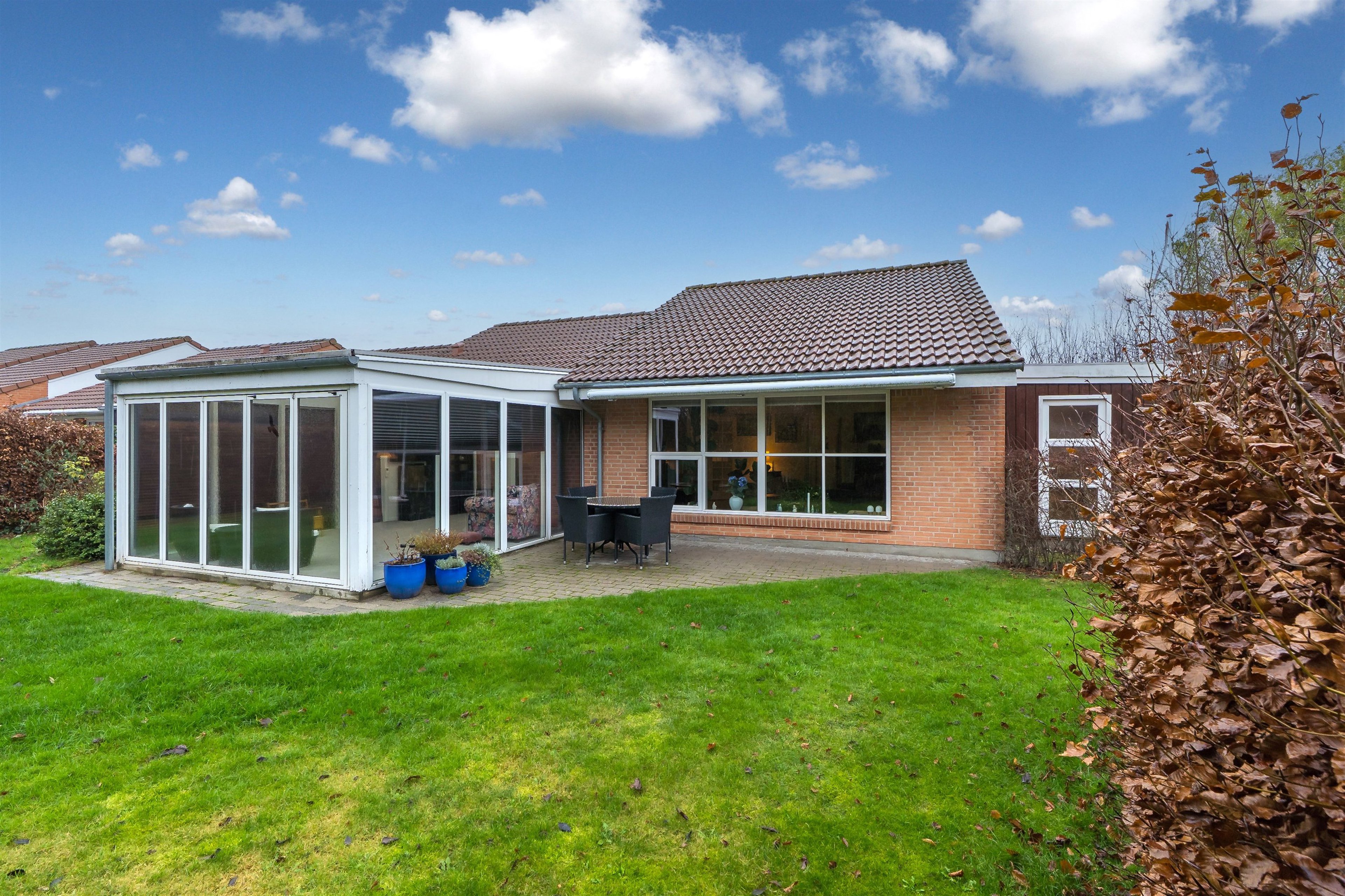 Den store, lyse havestue fungerer som et ekstra opholdsrum – perfekt til de dage og aftener, hvor vejret ikke helt tillader, at man sidder udenfor, men hvor man stadig vil nyde haven og naturen tæt på.