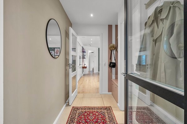 Allerede ved ankomst opleves boligens imødekommende udtryk, og indenfor mødes man af en funktionel entré med god plads til overtøj og hverdagens praktiske behov. Herfra åbner boligen sig op mod hjemmets naturlige samlingspunkt – det rummelige køkken/alrum i åben forbindelse med stuen.