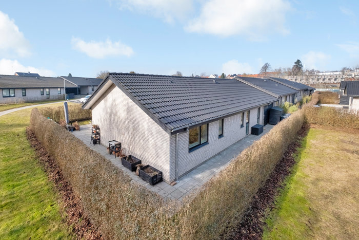 Udendørs venter en overskuelig og nem have med terrassemiljø, hvor solen kan nydes i rolige omgivelser. Her er plads til både grill, havemøbler og leg. Til rækkehuset hører carport og redskabsrum, hvilket fuldender det funktionelle helhedsindtryk.
