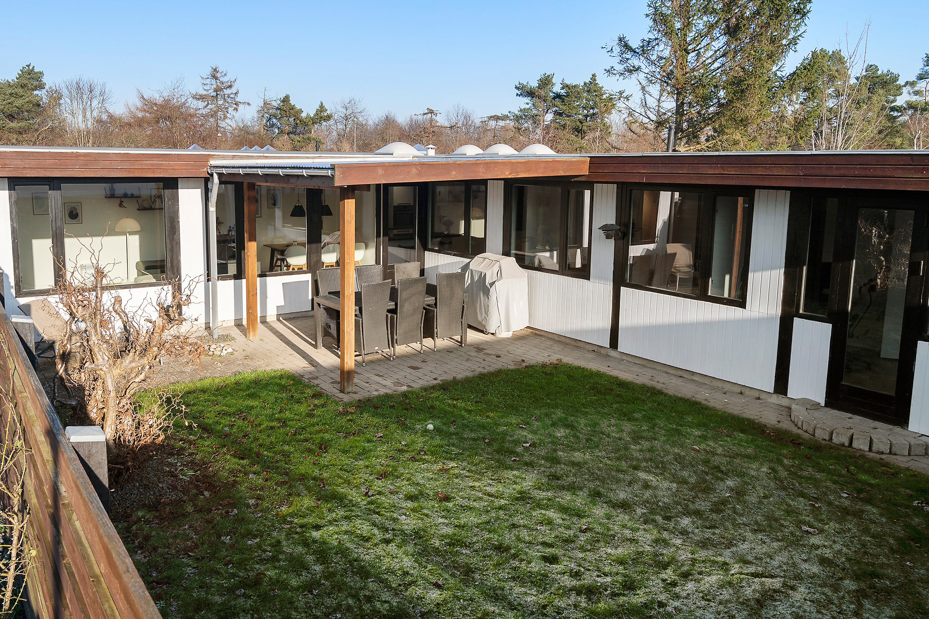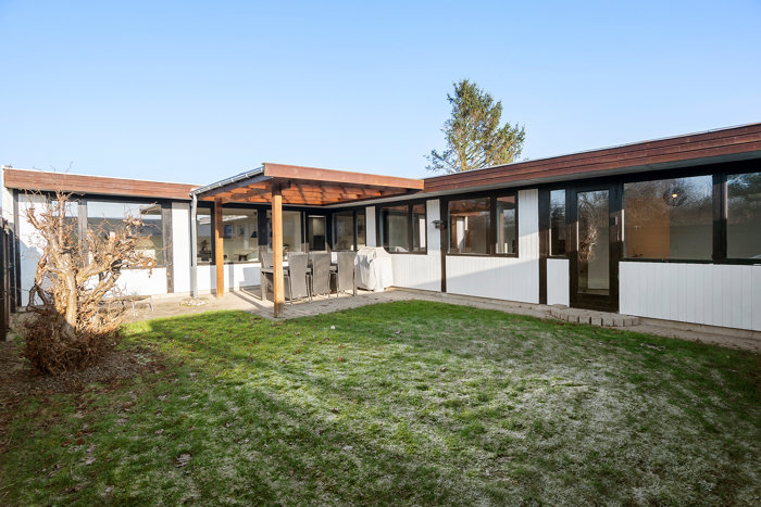 Udendørs finder du en hyggelig overdækket terrasse, der inviterer til afslapning og samvær i al slags vejr. Haven er nem og overskuelig og kræver minimal vedligeholdelse.