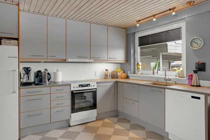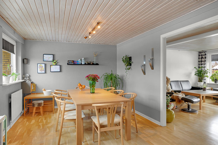 Husets klassiske elementkøkken har god plads til et stort spisebord, hvor familien kan samles, og de store vinduer sikrer et dejligt lysindfald. Stuen er rummelig og nem at indrette med direkte udgang til en sydvendt have og terrasse, hvor solen kan nydes dagen lang.