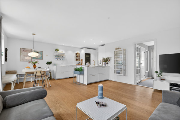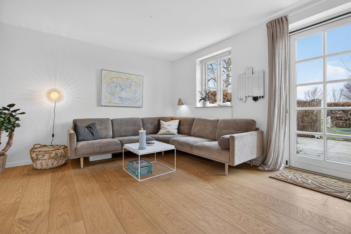 Det ligner en klassisk egnsgård, og det er heller ikke helt forkert. Men samtidig må man sige, at de indre rammer for dette rækkehus er udpræget tidssvarende. Boligen er velholdt, lys og lige til at leve i – med et lækkert lysindfald og et udnyttet loftsrum i boligstandard, som er den lille joker i hverdagen.