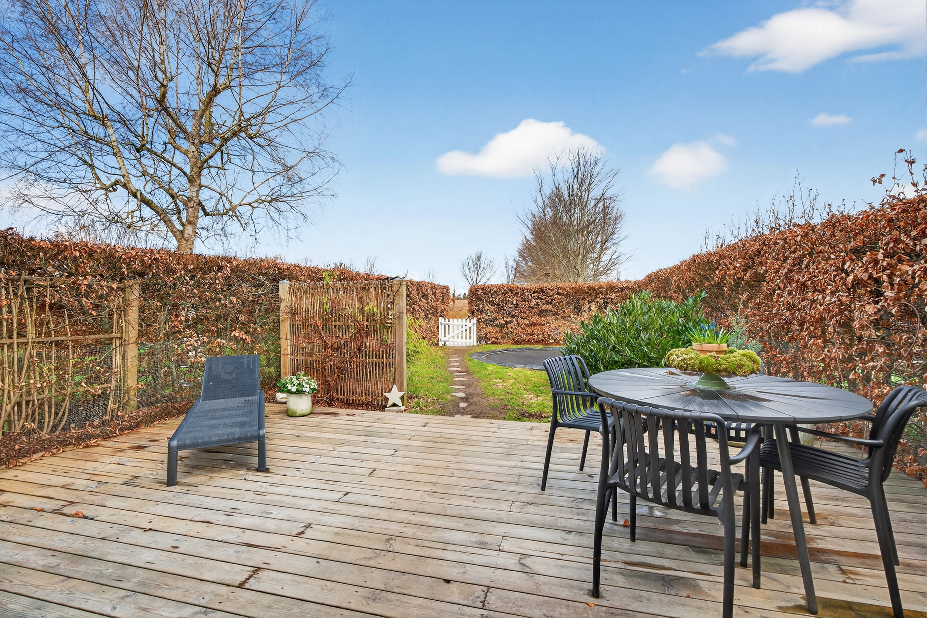 Jeres egen have er rar uden at være besværlig. Den er privat og overskuelig med en ugeneret træterrasse og en nedgravet trampolin, der allerede har forstået sin rolle. Og lige på den anden side af jeres tætte bøgehæk byder det store, parkagtige fællesareal velkommen med stier og siddepladser – en slags grøn gårdsplads i opdateret form.
