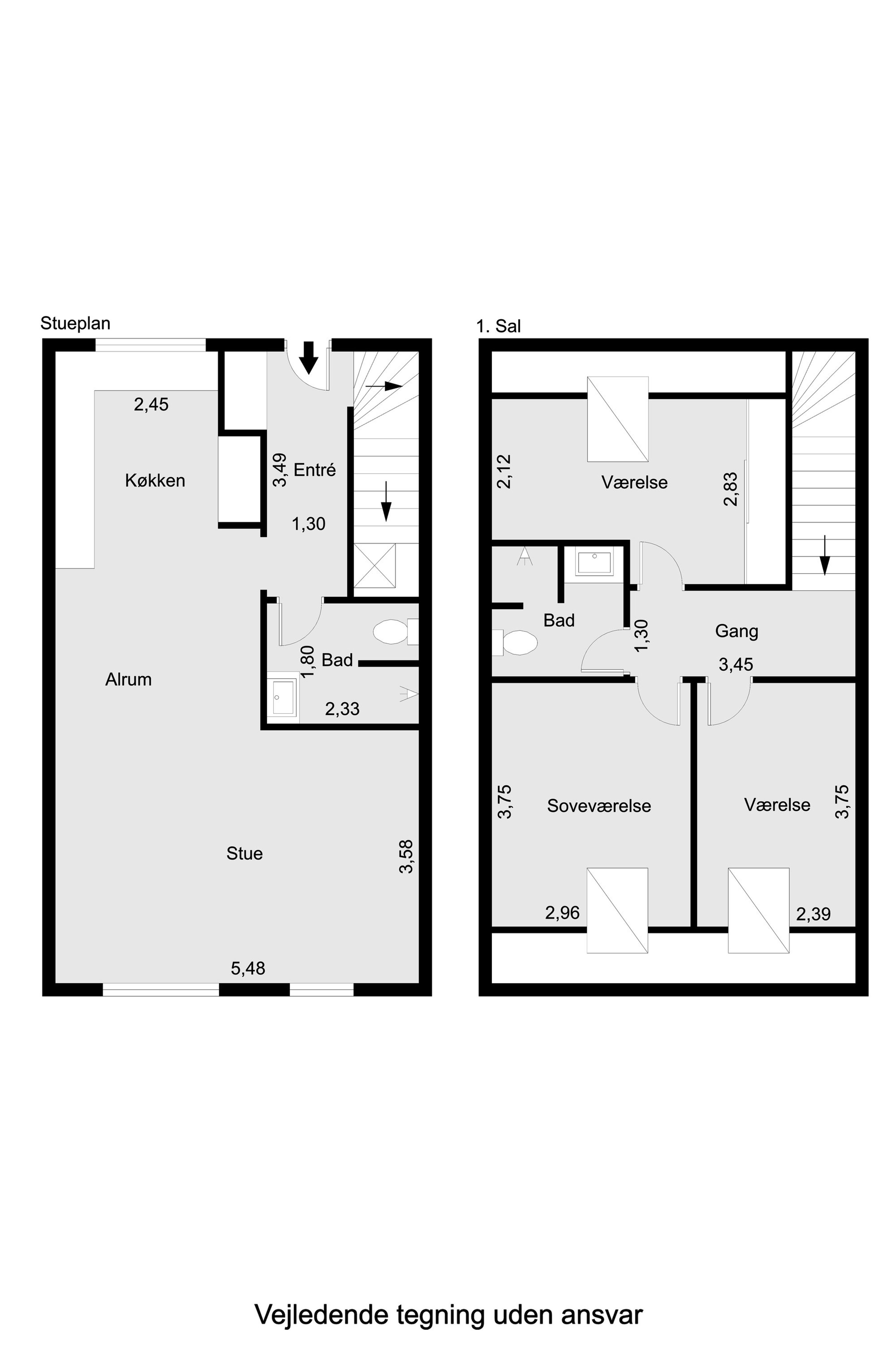 Alle boligerne er fordelt over to plan, hvor leverummene er i stueplan og værelserne på 1 sal. Du bliver budt indenfor i entreen, hvorfra også det ene af boligens badeværelser ligger. Herfra træder du ind i det åbne køkken/alrum stue ud i et. Hvor lysindfald er nøgleordet. Rummet åbner sig op og giver tillige adgang ud til den flisebelagte terrasse. Her er god plads til at skabe flere hyggelige rum, i samme rum. I entreen ligger trappen til første sal, hvorfra der fordeler sig to gode værelser, samt et mindre værelse og boligens andet badeværelse. Hele boligen opvarmes med fjernvarme, og der er desuden gulvvarme i alle rum. Derudover ventilationsanlæg, så indeklimaet er i top.