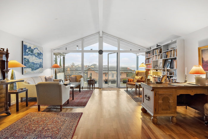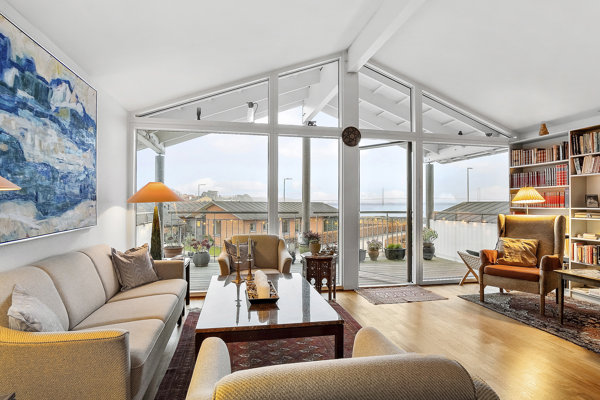 Videre ind i boligens hjerterum - et skønt stort stue-alrum med loft til kip og dejligt lysindfald fra flere sider samt meget smuk udsigt til Lillebælt. Endvidere skøn overdækket altan. Alrummet har rigelig plads både til spisebord, sofaafdeling og flere hyggekroge.