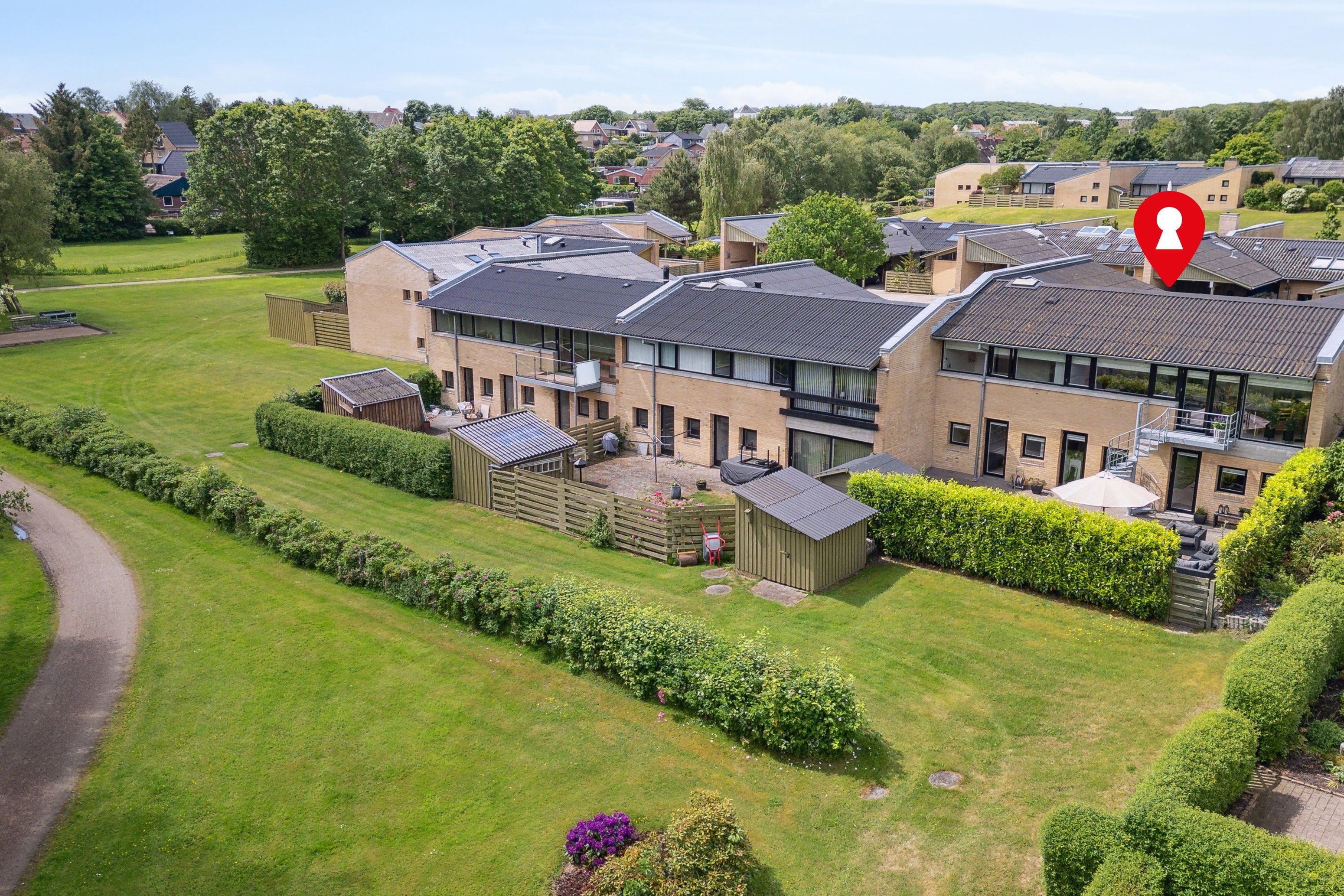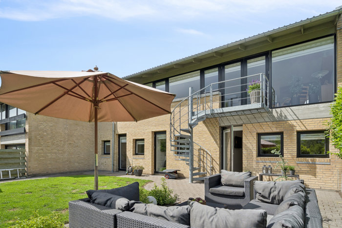 Foran boligen bydes du velkommen af en dejlig, lukket gårdhave med god plads til både havebord, loungemøbler og grill – et skønt og privat uderum, der indbyder til hyggelige stunder. Hertil kommer integreret carport med tilhørende udhus samt en god, lukket have på den modsatte side med flisebelagt terrasse og ekstra udhus.