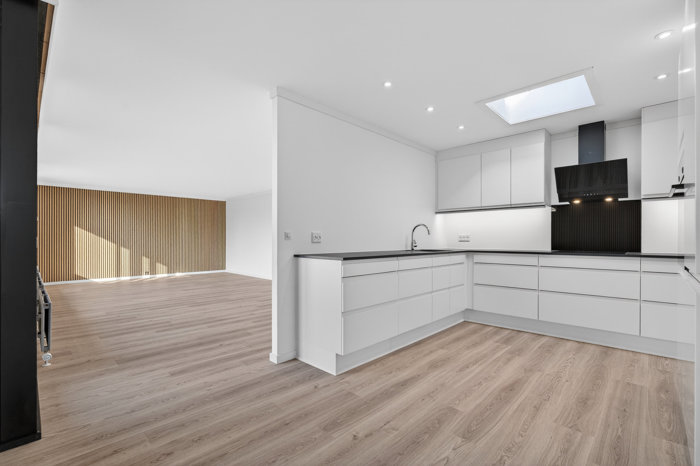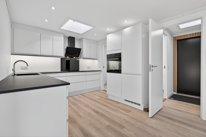 At I samtidig kan se frem til en moderniseret og indflytningsklar bolig gør blot helheden bedre. Stort set hele gårdhavehuset er renoveret, og faktisk er det kun badeværelset, der ikke længere kan kaldes helt nyt. Det er dog opdateret og fremstår derfor lyst og pænt. Resten af boligens 114 m2 er kendetegnet ved et ensartet og gennemført materialevalg med lyse gulve, gipslofter og akustikvægge med trælameller på flere vægge. Stilen er let og nordisk, hvilket blandt andet ses i køkkenet, som har hvide, grebsfri elementer og mørk bordplade.