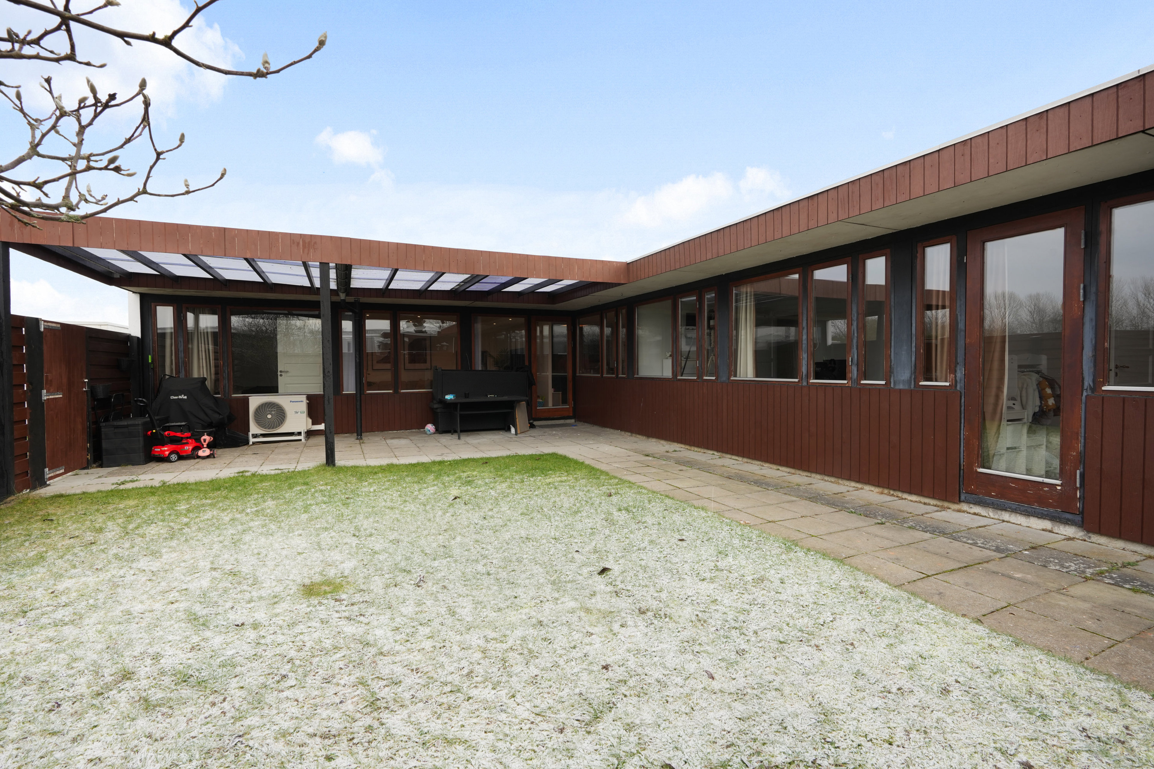 Den hyggelige, private gårdhave er syd- og vestvendt, og derfor er der også en særlig fornuft i, at en del af terrassen er overdækket. I har endda direkte forbindelse til den fælles grønne firkant via havelågen.
